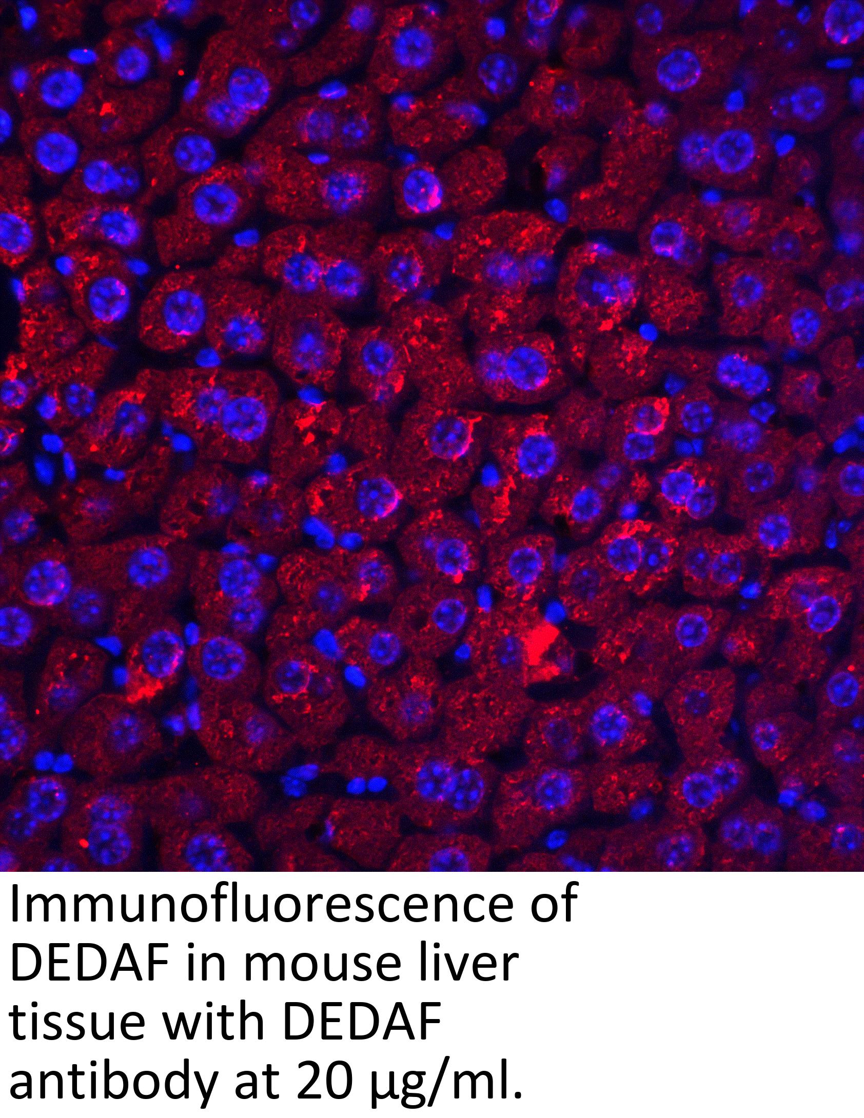 DEDAF can be used for detection of DEDAF by Western blot at 1 μ g/mL. Antibody can also be used for immunohistochemistry starting at 5 μ g/mL. For immunofluorescence start at 20 μ g/mL.