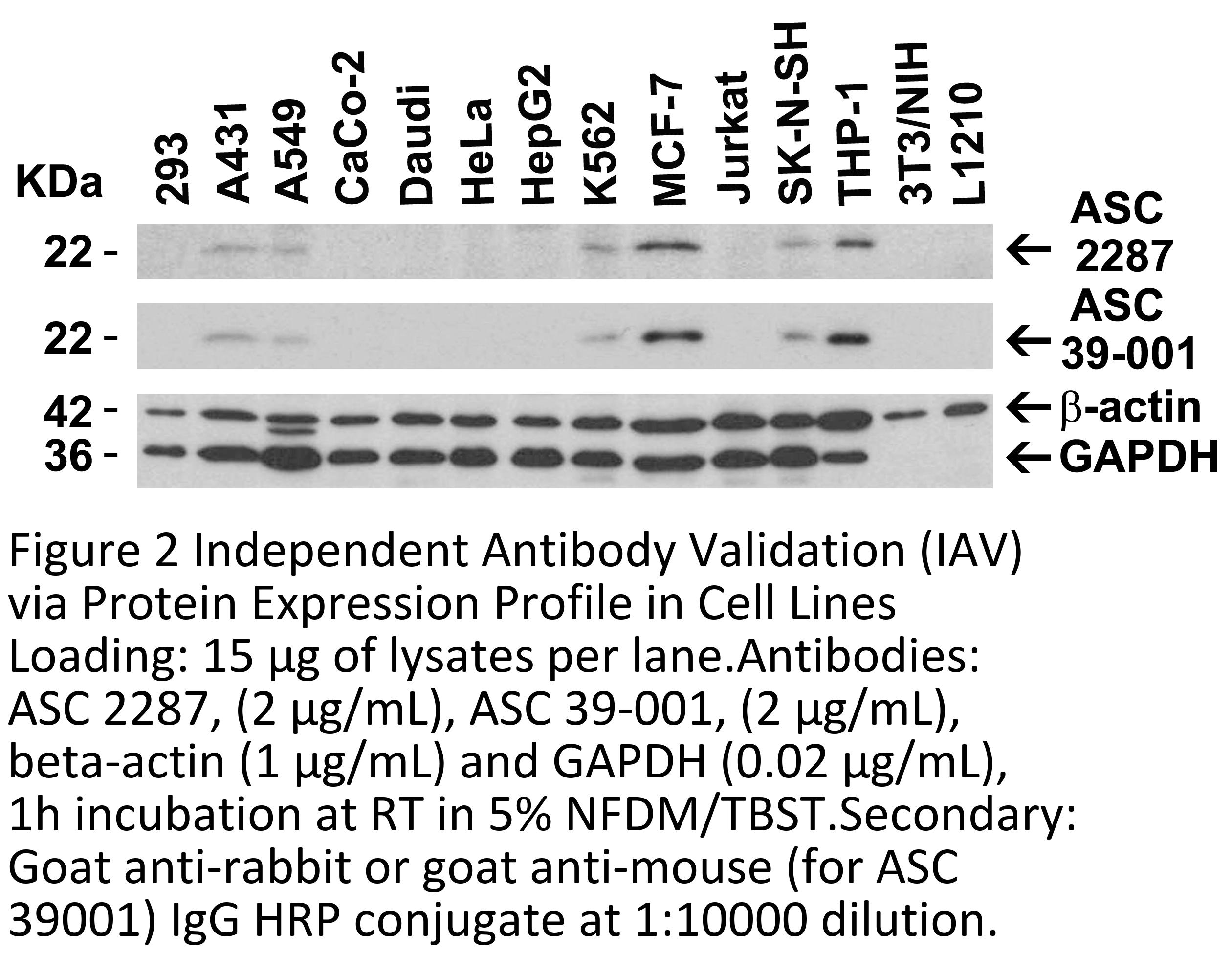 Independent Antibody Validation in Cell lines (Figure 2) shows similar ASC expression profile in human and mouse cell lines detected by two independent anti-ASC antibodies that recognize different epitopes, 2287 against C-terminus domain and 39-001 against full length human recombinant protein.  ASC proteins are detected in some of tested cell lines at different expression levels by the two independent antibodies.