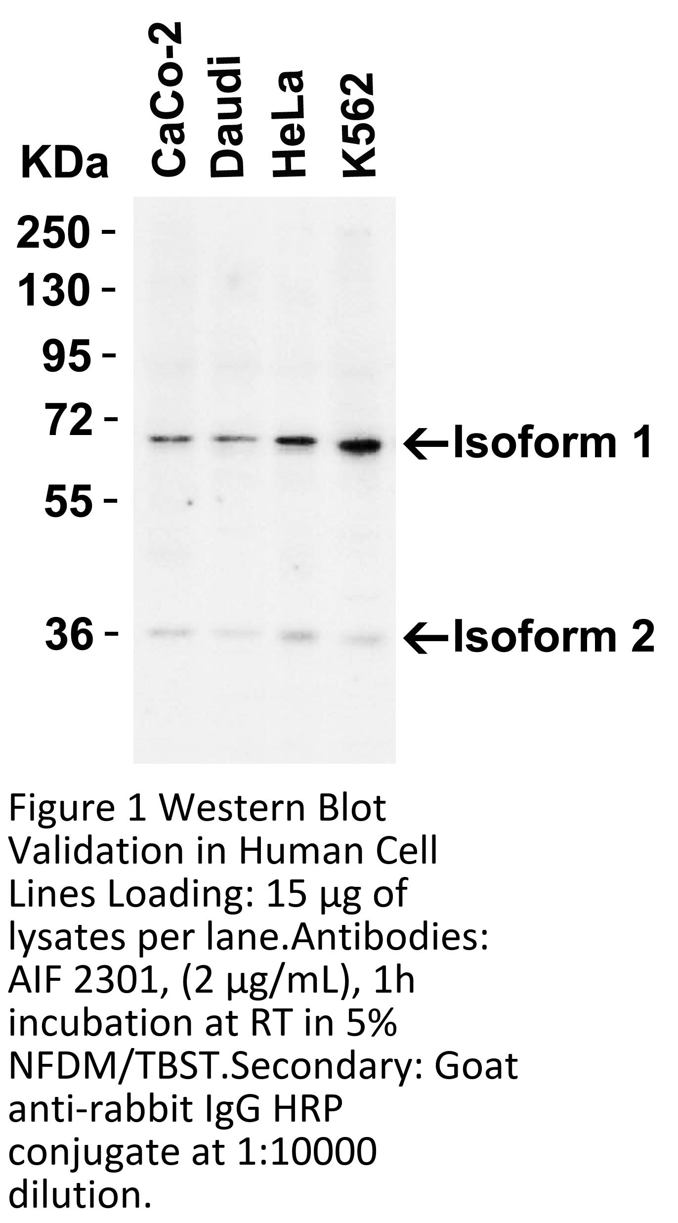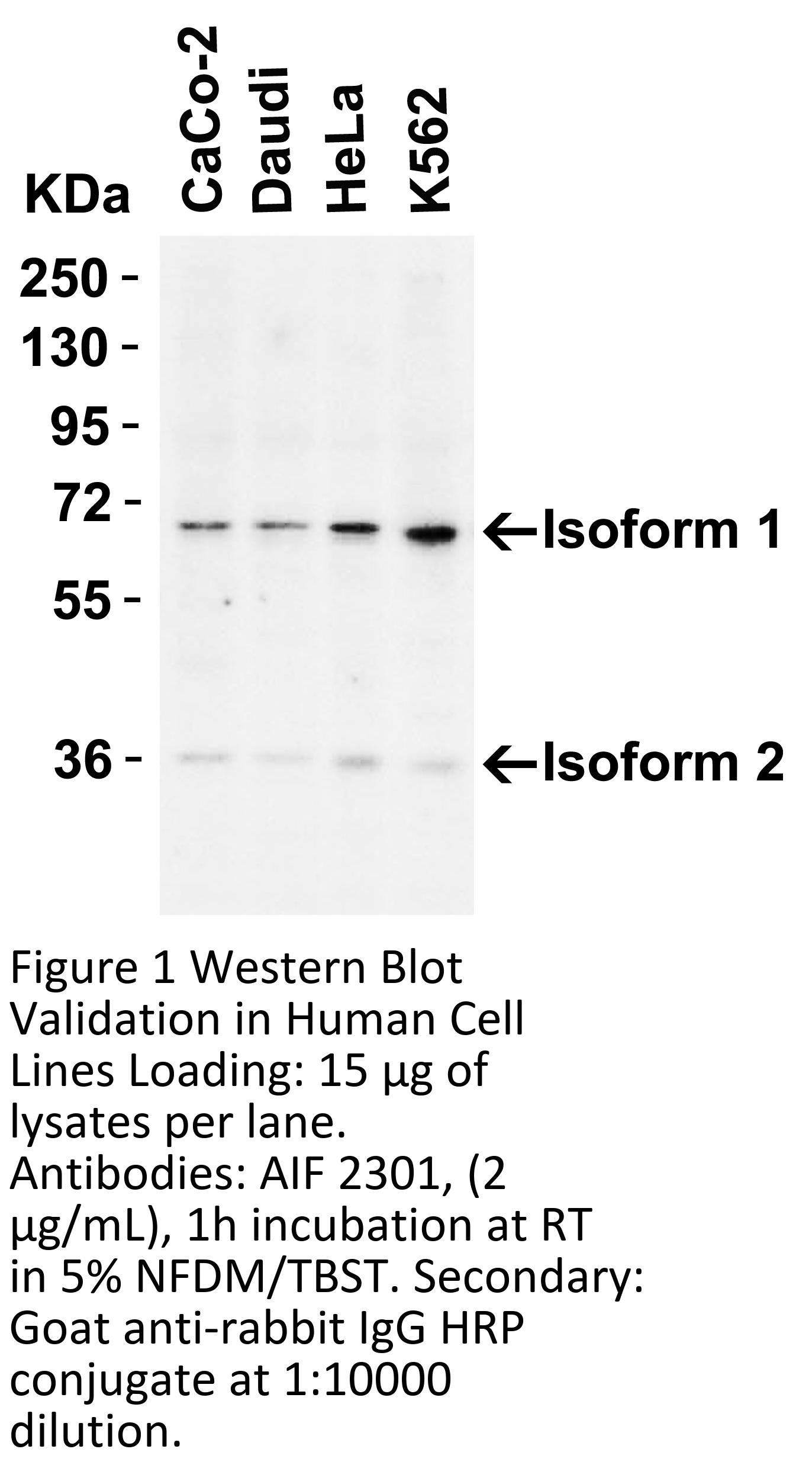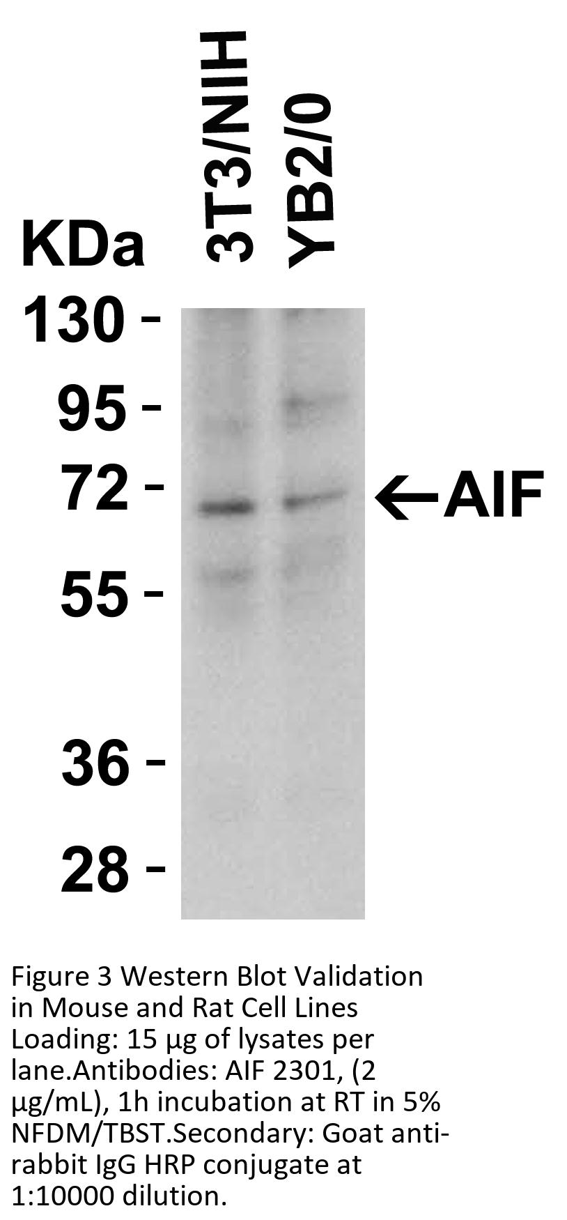 Independent Antibody Validation in Cell lines (Figure 2) shows similar AIF expression profile in human and mouse cell lines detected by three independent anti-AIF antibodies that recognize different epitopes, 2267 against central domain, 2239 against N-terminus domain and 2301 against C-terminus domain. AIF proteins are detected in the most tested cell lines at different expression levels by the three independent antibodies.