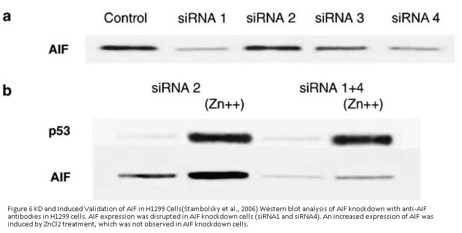 KD Validation (Figure 6, 7): Anti-AIF antibody specificity was further verified by AIF specific knockdown. AIF signal in H1299 cells and AIF stable cells transfected with AIF siRNAs was disrupted in comparison with that in cells transfected with control siRNAs.
