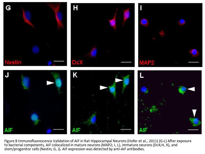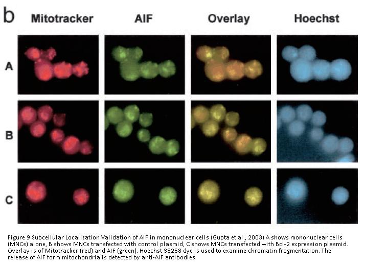 Localization Validation (Figure 9): AIF detected by anti-AIF antibodies is colocalized with Mitotracker (mitochondrion marker). AIF is localized in mitochondria.