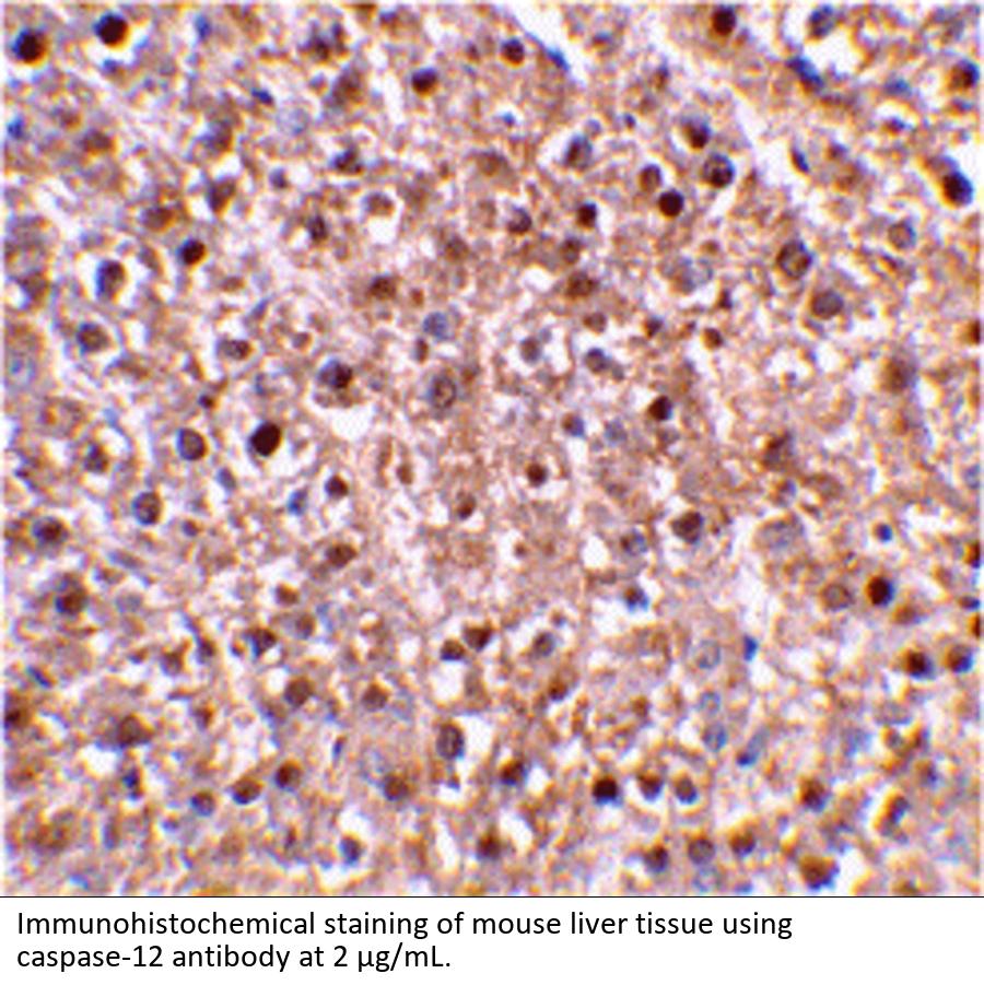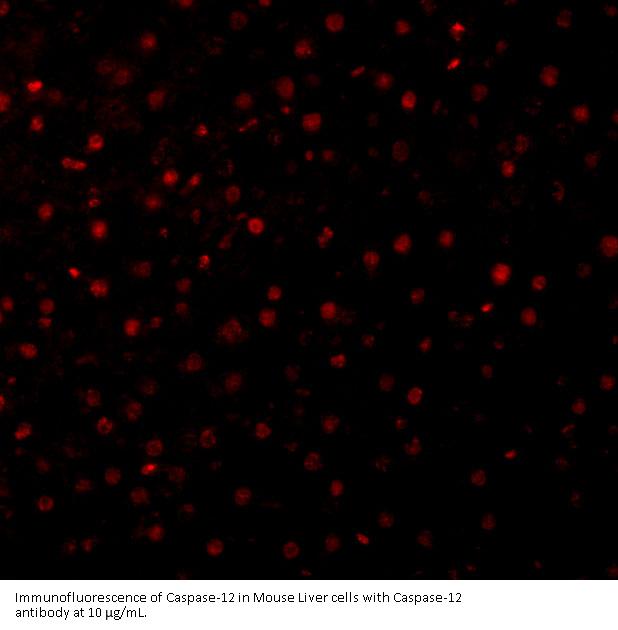 Caspase-12 antibody can be used for detection of caspase-12 by Western blot at 1 μ g/mL. Antibody can also be used for immunohistochemistry starting at 2 μ g/mL. For immunofluorescence start at 10 μ g/mL.