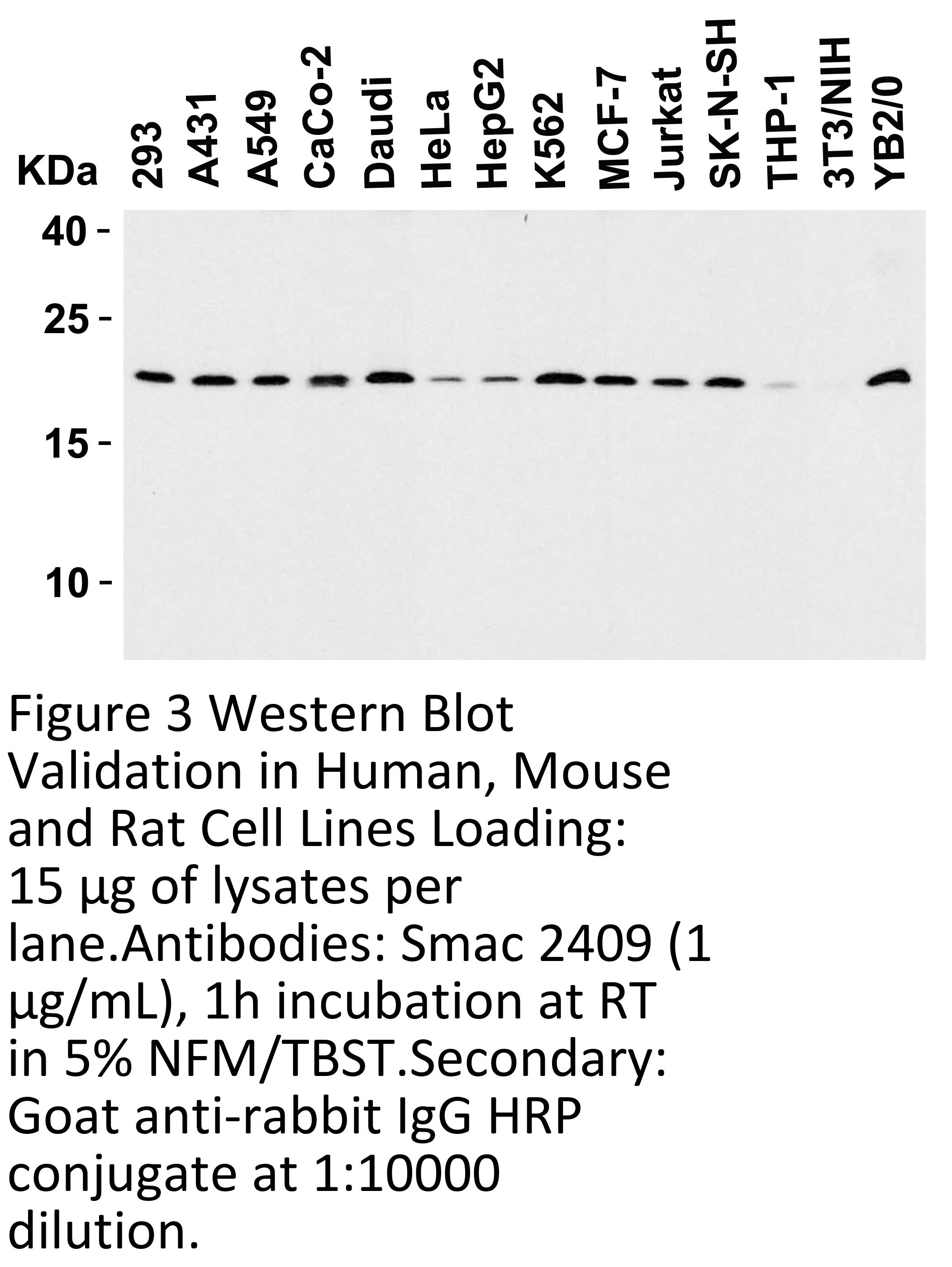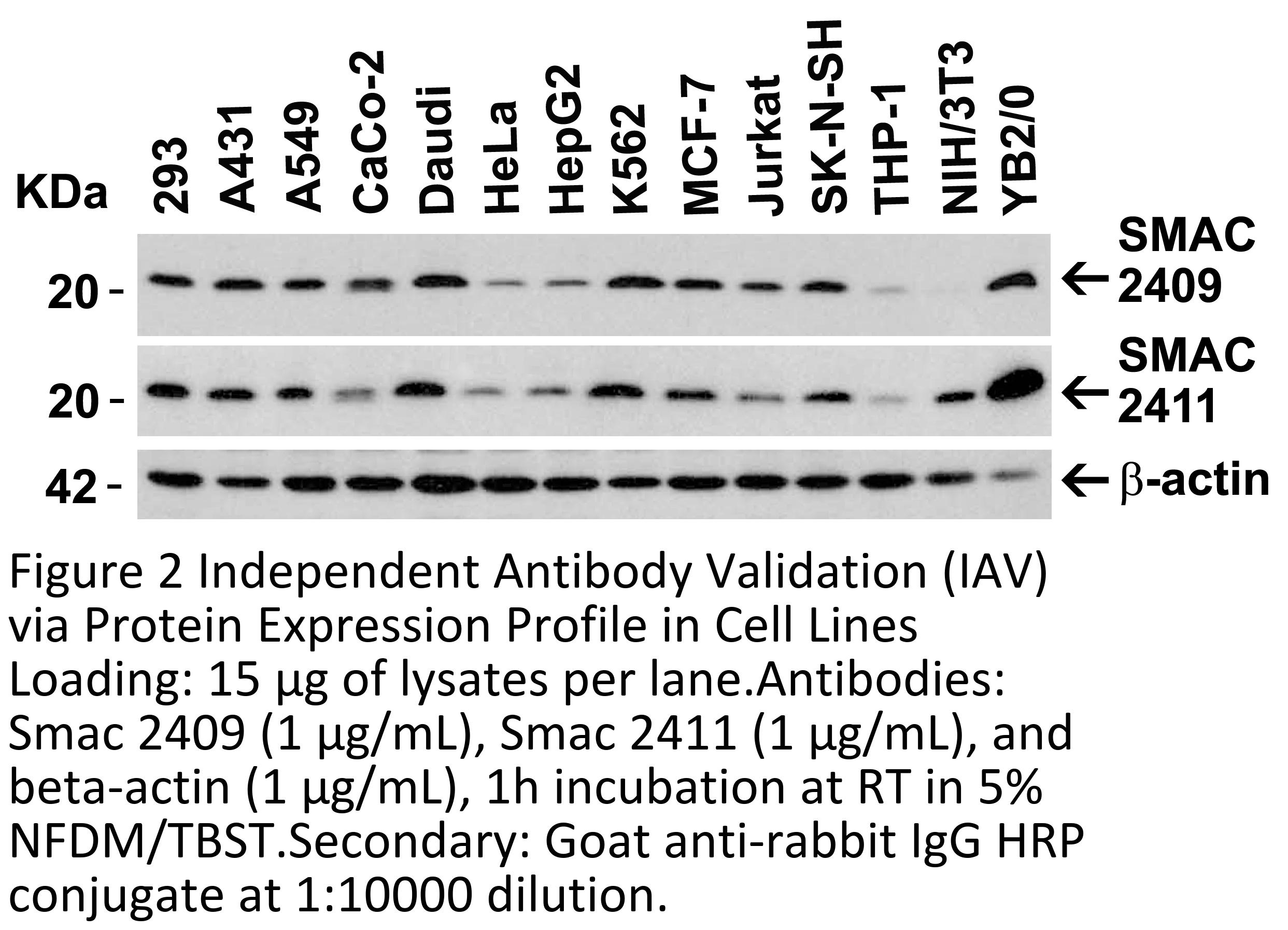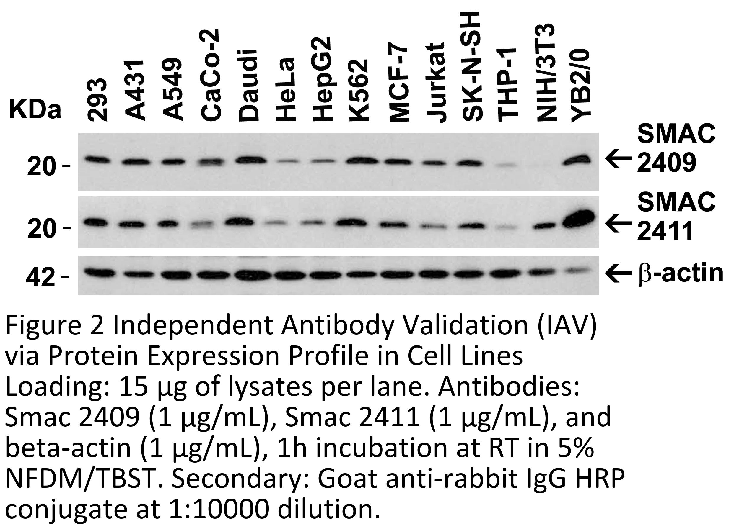 Independent Antibody Validation in Cell lines (Figure 2) shows similar Smac expression profile in human and mouse cell lines detected by two independent anti-Smac antibodies that recognize different epitopes, 2409 against human C-terminus domain and 2411 against murine C-terminus domain. Smac proteins are detected in the most tested cell lines at different expression levels by the two independent antibodies.