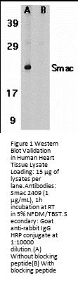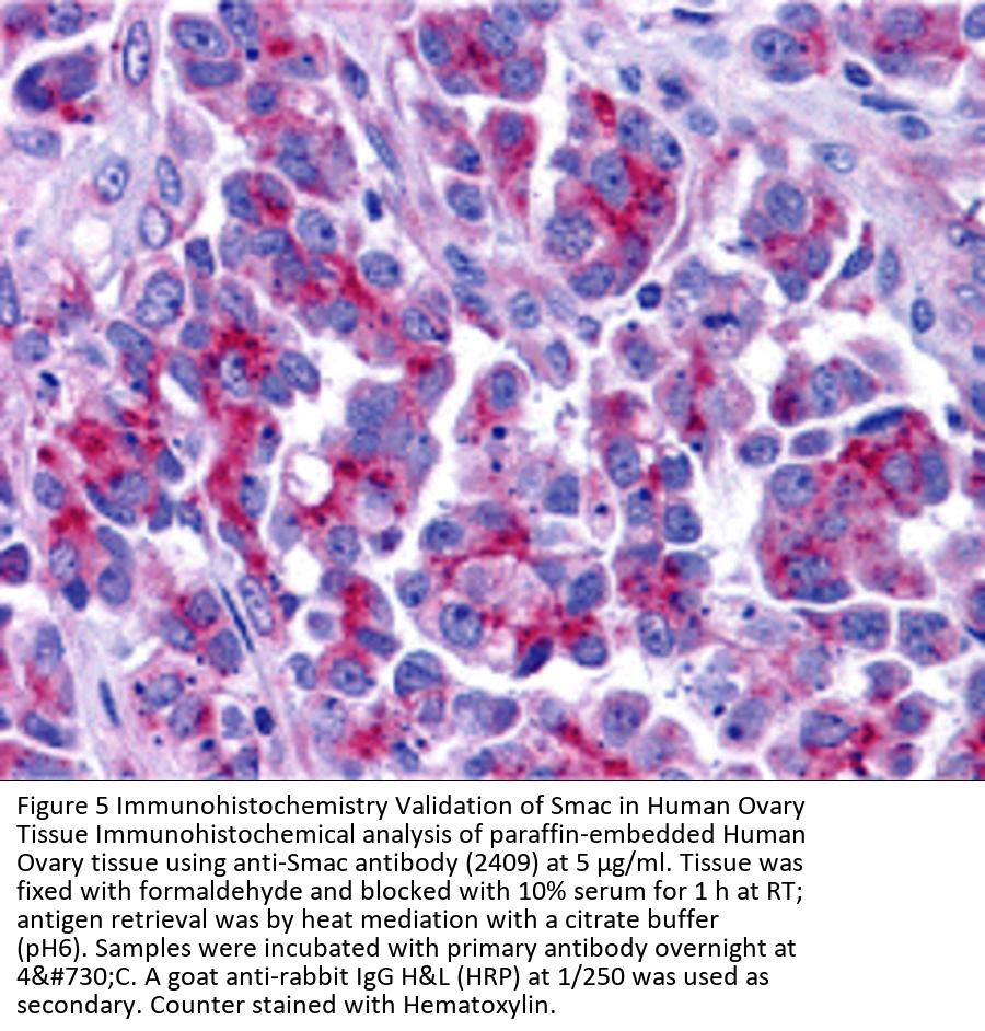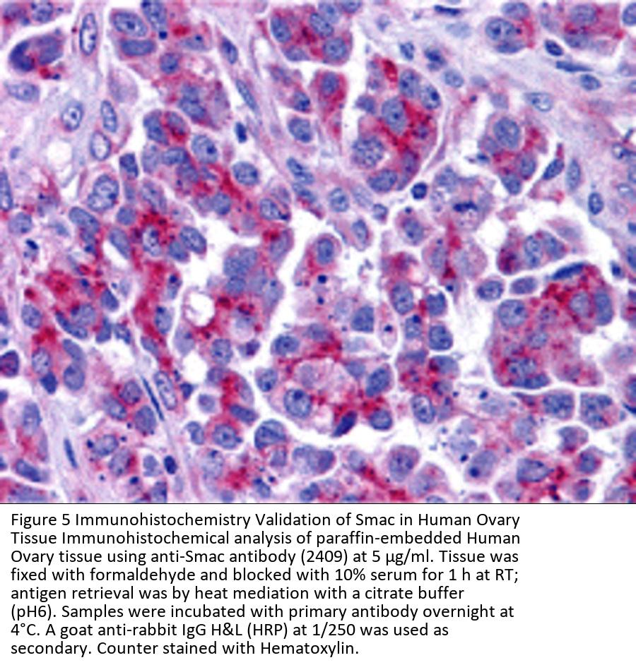 Smac Antibody: The inhibitor of apoptosis proteins (IAPs) regulate programmed cell death by inhibiting members of the caspase family of enzymes. A novel mammalian protein that binds to IAPs and neutralizes the inhibitory effect of IAPs on caspases was recently identified and designated Smac/DIABLO. Smac/DIABLO is a mitochondrial protein that is released along with cytochrome c during apoptosis and activates cytochrome c/Apaf-1/capase-9 pathway. Analysis of the structural basis of Smac/DIABLO reveals that the N-terminal amino acids are required for binding of Smac/DIABLO to IAPs and activation of caspases. Smac/DIABLO is expressed in a variety of human and mouse tissues.