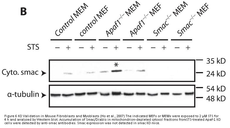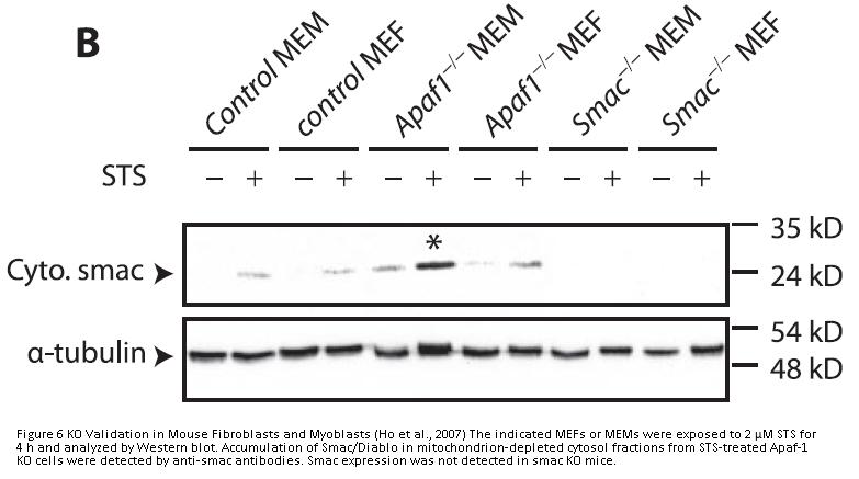 KO Validation (Figure 6): Anti-Smac antibody specificity was further verified by Smac knockout mice. Smac signal smac KO mice was disrupted as compared to control.
