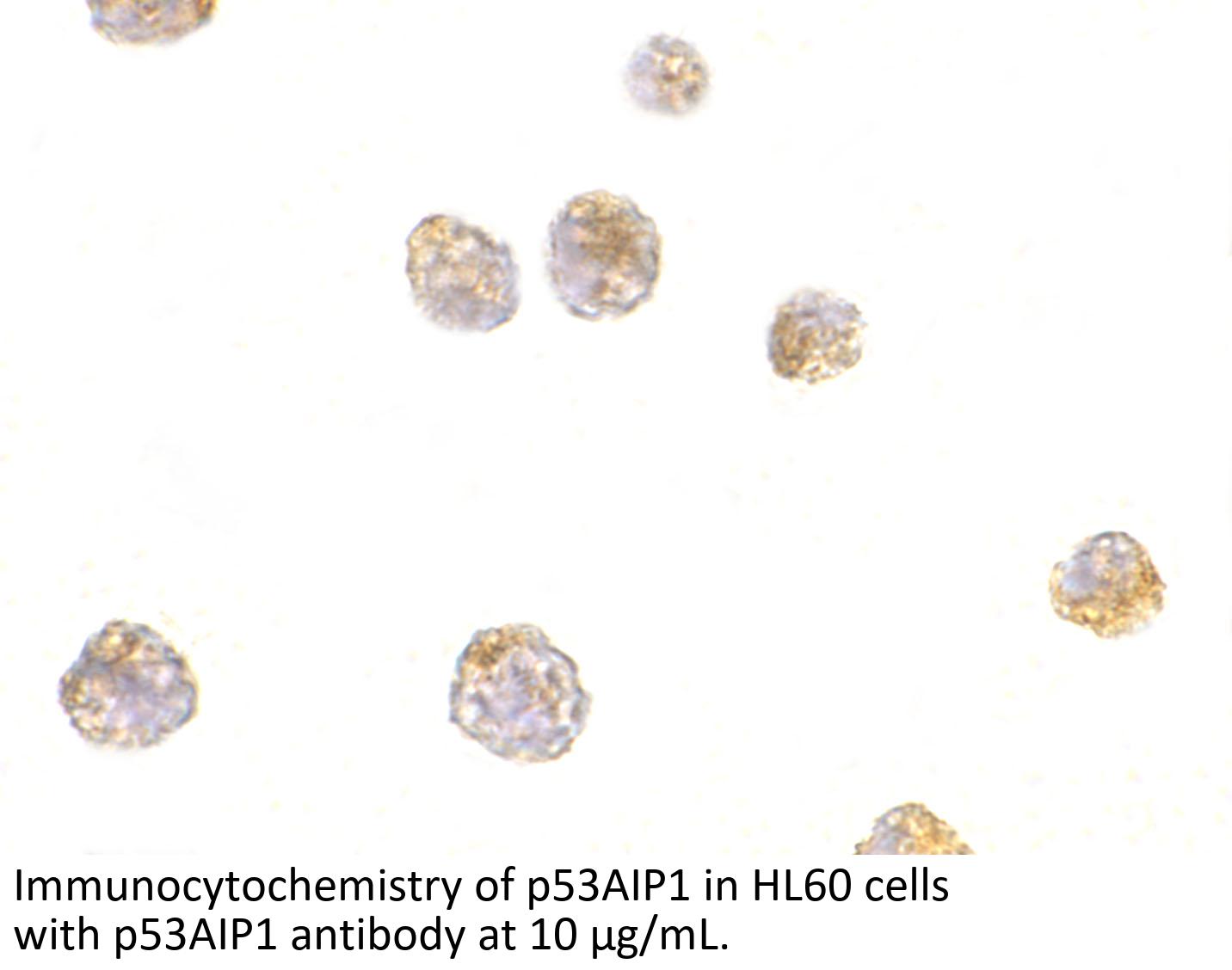 p53AIP1 antibody can be used for detection of p53AIP1 by Western blot at 4 - 8 μ g/mL. Antibody can also be used for immunocytochemistry starting at 10 μ g/mL. For immunofluorescence start at 20 μ g/mL.