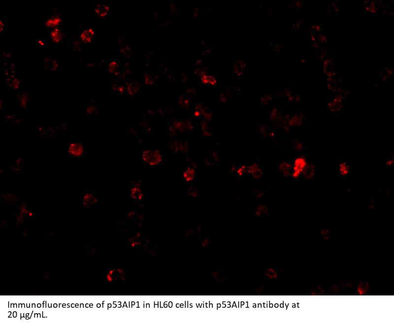p53AIP1 Antibody: The p53 tumor-suppressor protein can induce apoptosis through transcriptional activation of several genes. One such protein p53AIP was initially identified through direct cloning of p53 binding sequences from human genomic DNA. Its expression is inducible by p53 following p53 phosphorylation on Ser-46, and ectopic expression of p53AIP leads to apoptotic cell death. Both the phosphorylation of p53 and the induction of p53AIP were blocked by inhibiting the expression of p53DINP1 by the introduction of antisense oligonucleotides to p53DINP1, suggesting that the apoptosis associated with p53AIP expression is regulated by p53DINP1. Finally, as adenovirus-mediated introduction of p53AIP has been shown to suppress tumor growth in vivo, it has been suggested that p53AIP gene transfer may become a useful strategy for the treatment of p53-resistant cancers. Three isoforms of p53AIP are known to exist; this antibody will detect all three.