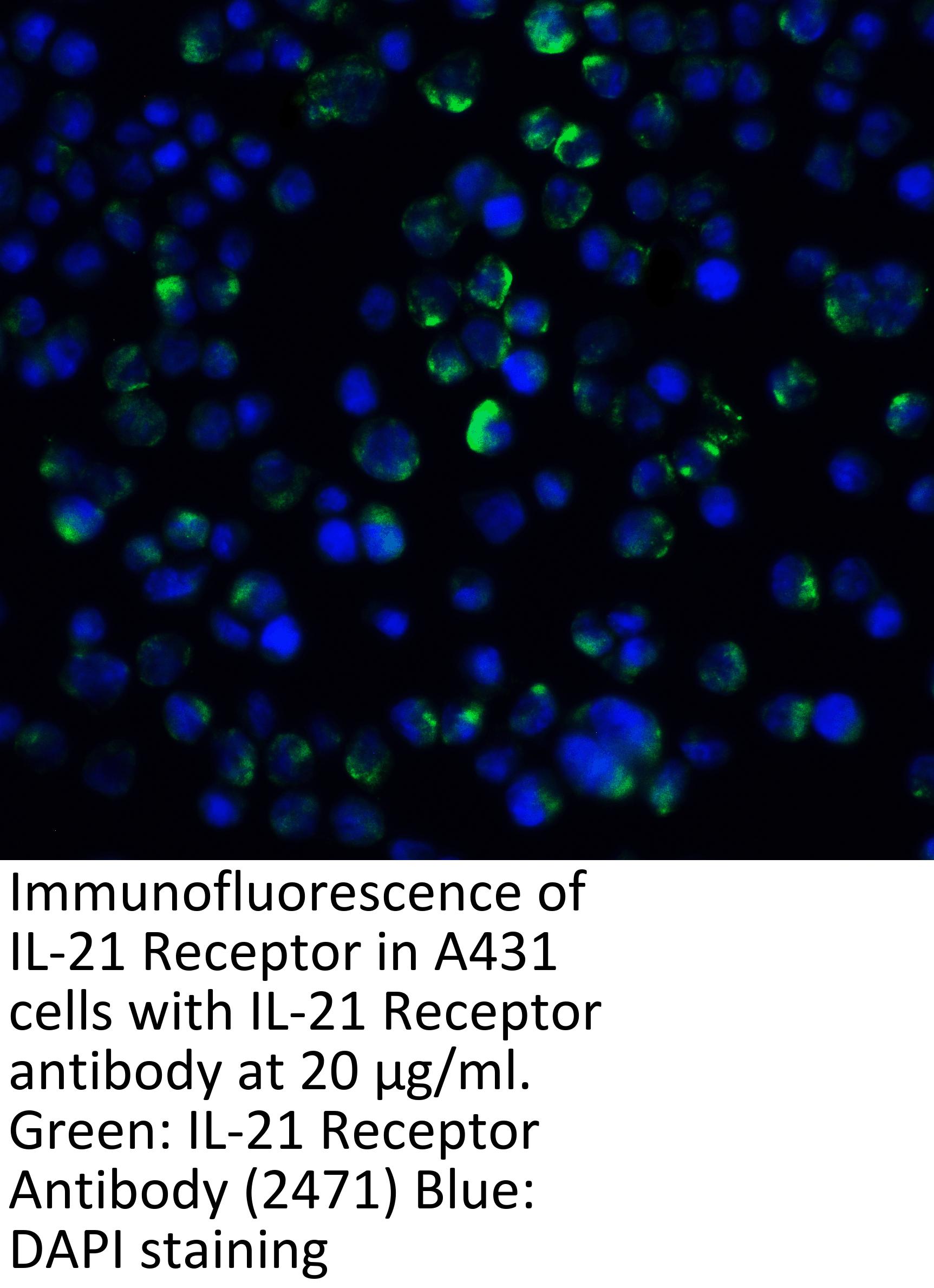 IL-21 receptor antibody can be used for detection of IL-21 receptor by Western blot at 1 μ g/mL. An approximately 60 kDa band can be detected. For immunofluorescence start at 20 μ g/mL.