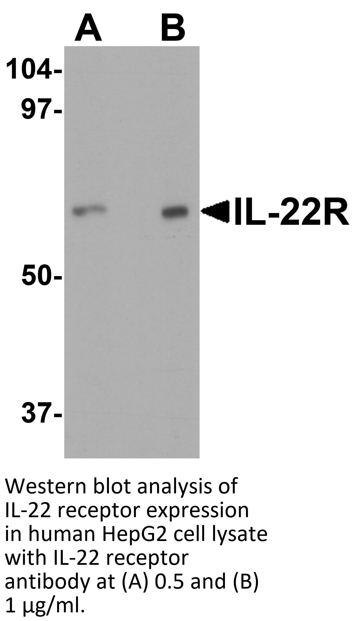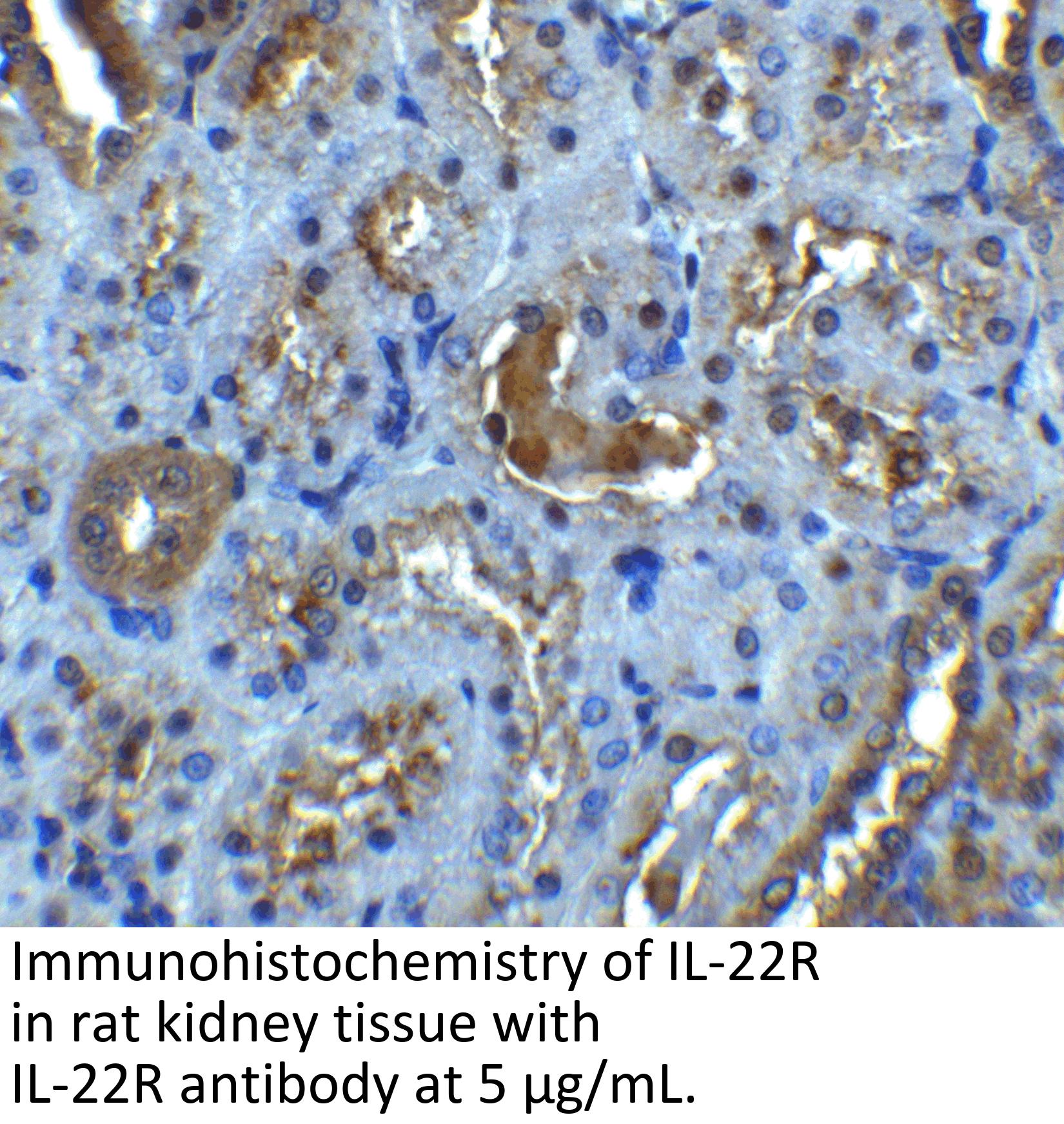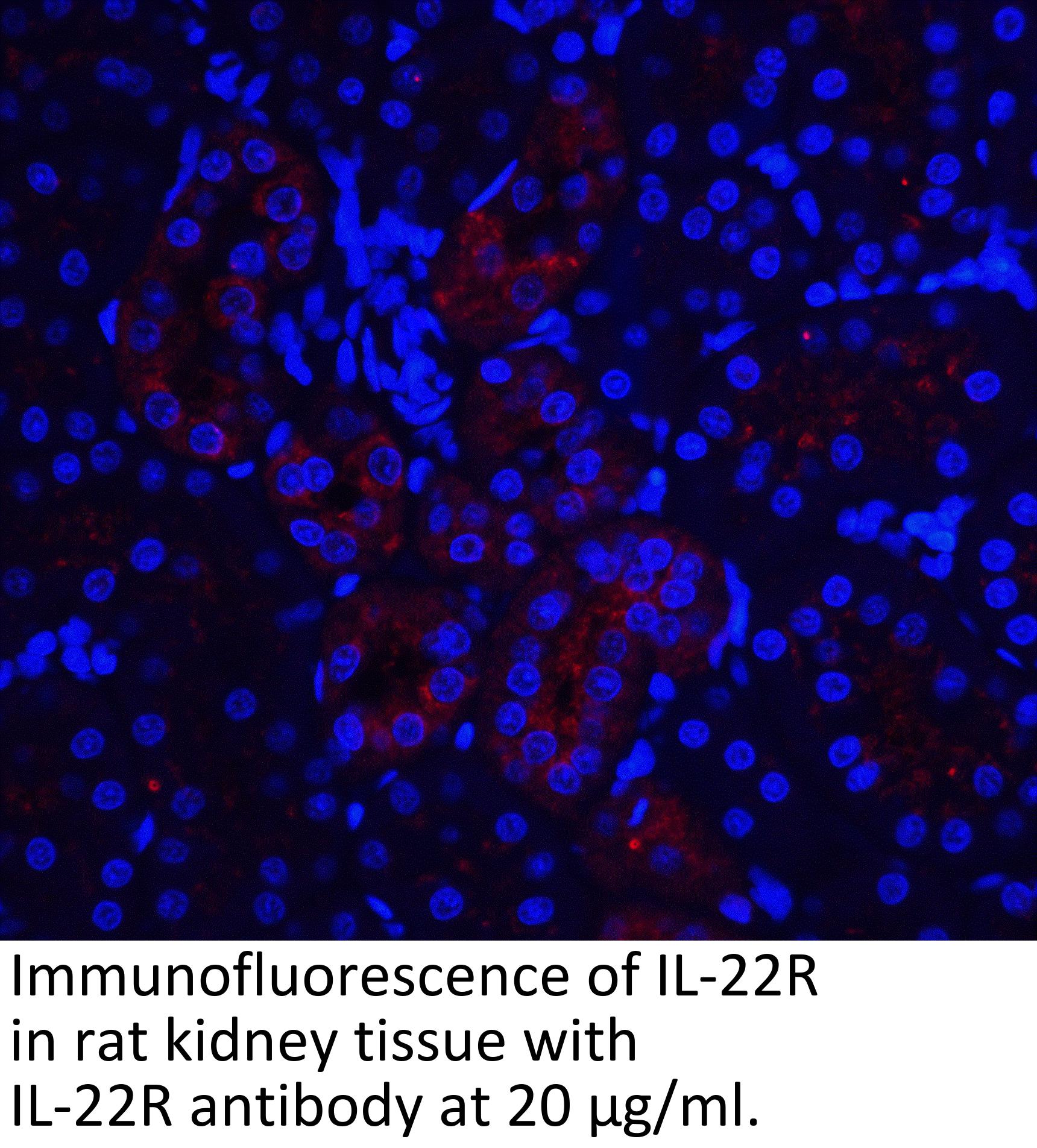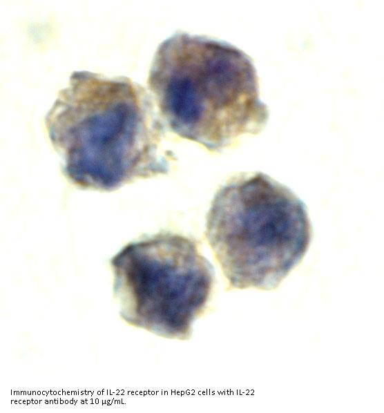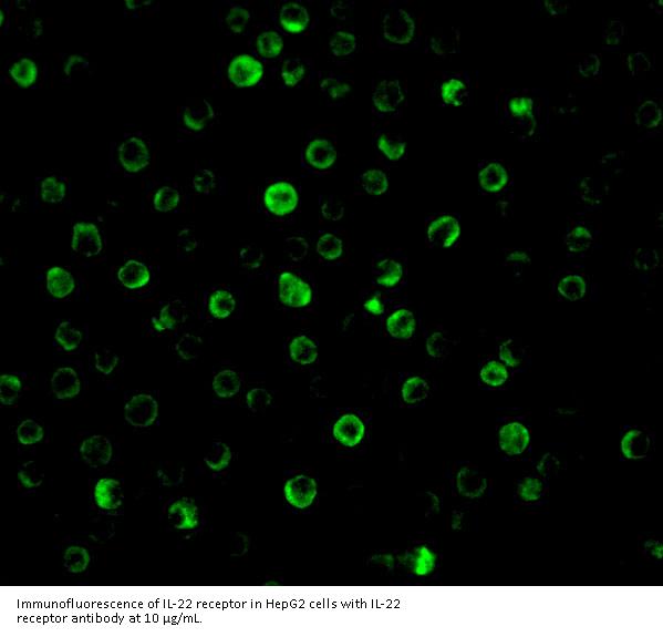 IL-22 receptor antibody can be used for detection of IL-22 receptor by Western blot at 0.5-1 μ g/mL. Antibody can also be used for immunocytochemistry starting at 10 μ g/mL and immunohistochemistry starting at 5 μ g/mL. For immunofluorescence start at 10 μ g/mL.