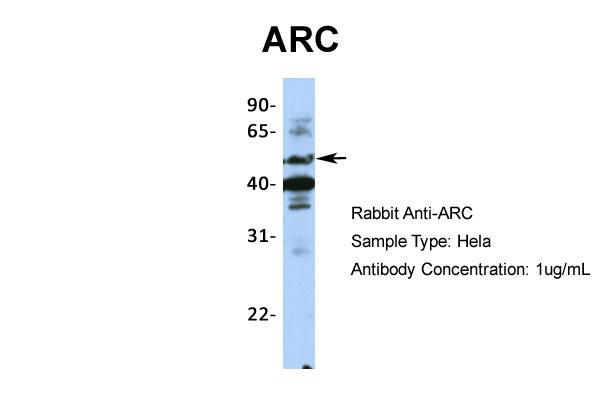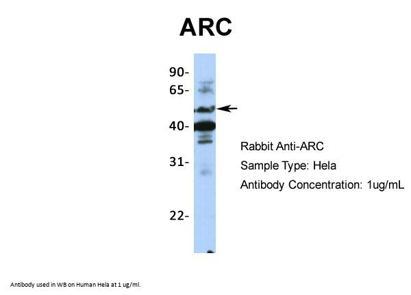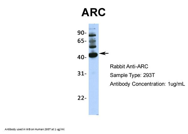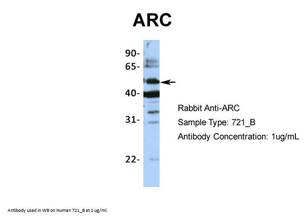 ARC antibody can be used for detection of ARC by ELISA at 1:312500. ARC antibody can be used for detection of ARC by western blot at 1 μ g/mL, and HRP conjugated secondary antibody should be diluted 1:50, 000 - 100, 000.