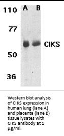 CIKS antibody was raised against a 14 amino acid peptide near the amino terminus of human CIKS.