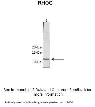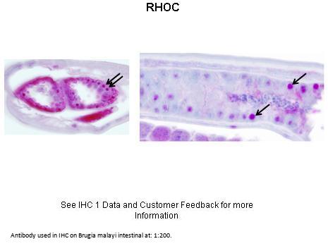 RHOC antibody can be used for detection of RHOC by ELISA at 1:62500. RHOC antibody can be used for detection of RHOC by western blot at 1 μ g/mL, and HRP conjugated secondary antibody should be diluted 1:50, 000 - 100, 000.