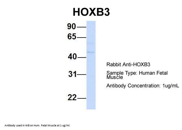 HOXB3 antibody can be used for detection of HOXB3 by ELISA at 1:312500. HOXB3 antibody can be used for detection of HOXB3 by western blot at 1 μ g/mL, and HRP conjugated secondary antibody should be diluted 1:50, 000 - 100, 000.