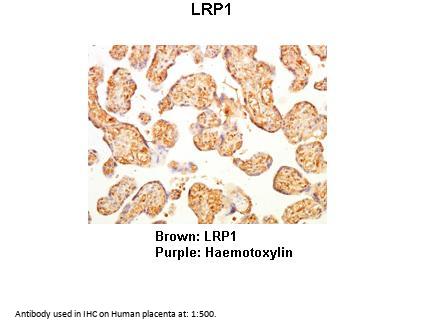 LRP1 antibody can be used for detection of LRP1 by ELISA at 1:1562500. LRP1 antibody can be used for detection of LRP1 by western blot at 1 μ g/mL, and HRP conjugated secondary antibody should be diluted 1:50, 000 - 100, 000.