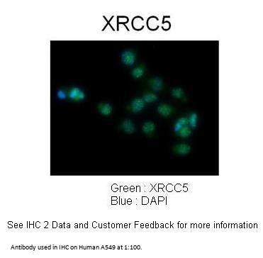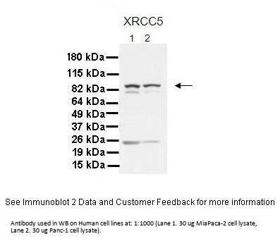 XRCC5 antibody can be used for detection of XRCC5 by ELISA at 1:12500. XRCC5 antibody can be used for detection of XRCC5 by western blot at 1.25 μ g/mL, and HRP conjugated secondary antibody should be diluted 1:50, 000 - 100, 000.