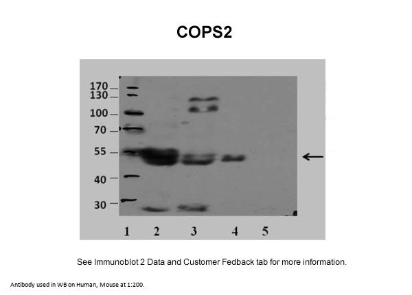 COPS2 antibody can be used for detection of COPS2 by ELISA at 1:312500. COPS2 antibody can be used for detection of COPS2 by western blot at 1.25 μ g/mL, and HRP conjugated secondary antibody should be diluted 1:50, 000 - 100, 000.