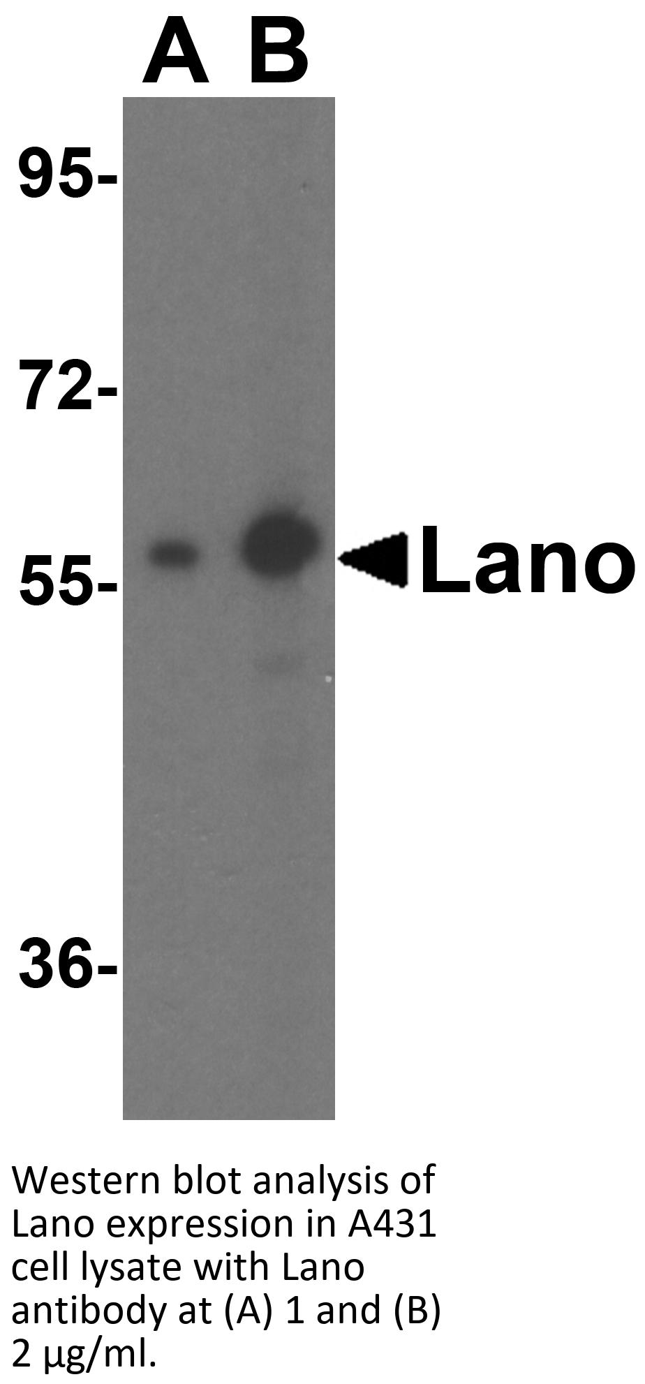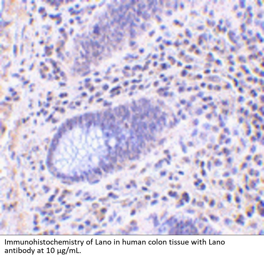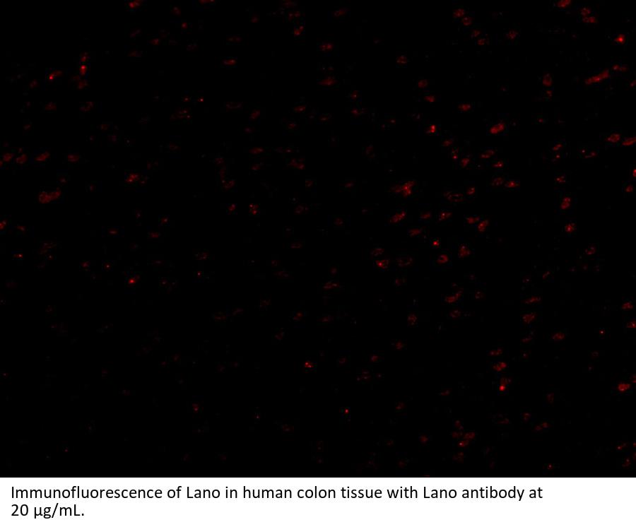 Lano antibody can be used for detection of Lano by Western blot at 1 - 2 μ g/mL. Antibody can also be used for immunohistochemistry starting at 10 μ g/mL. For immunofluorescence start at 20 μ g/mL.