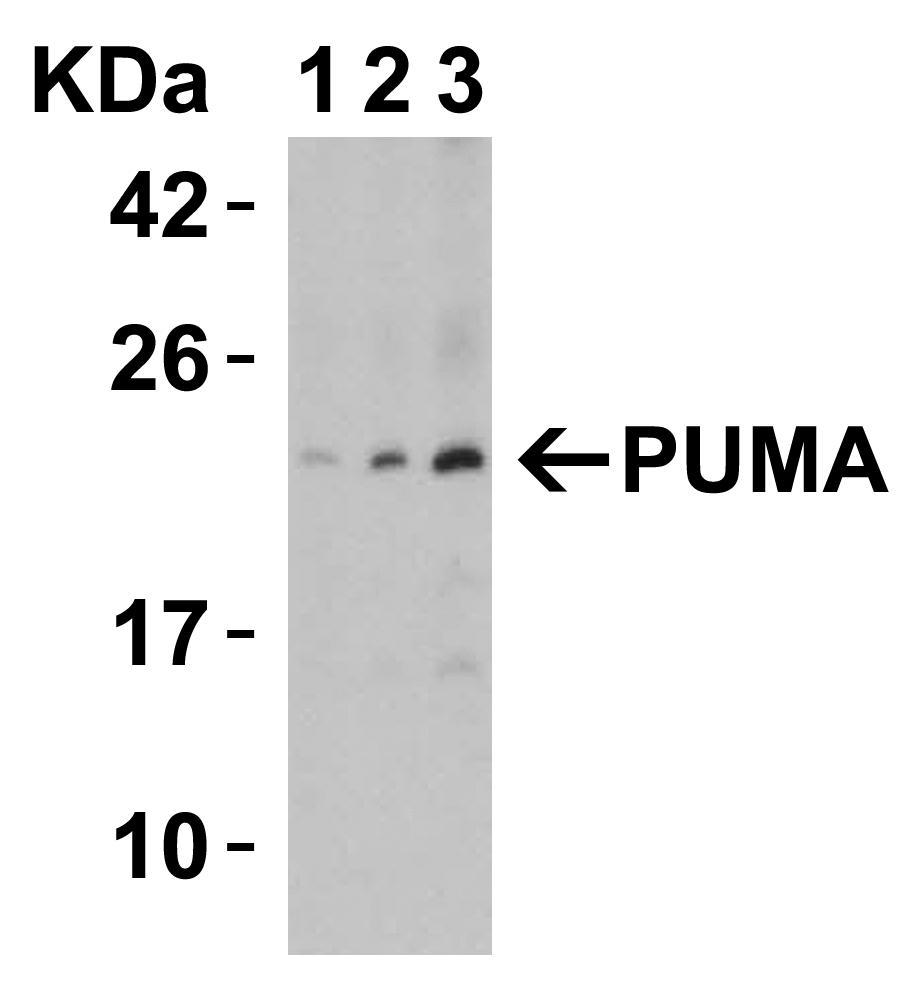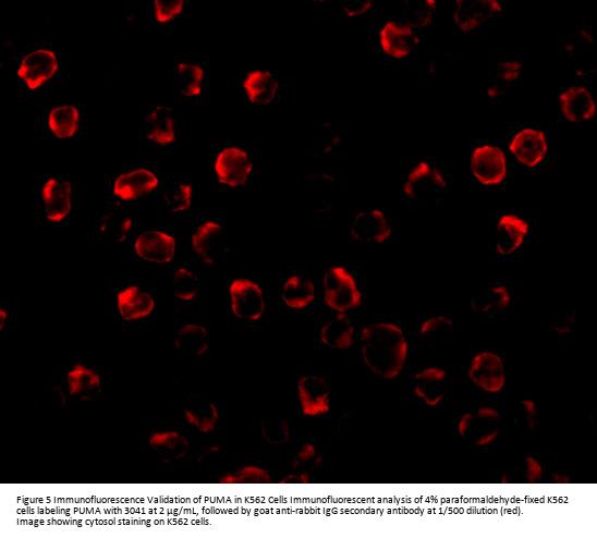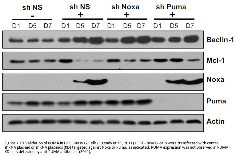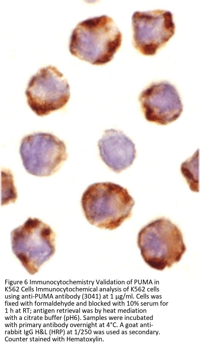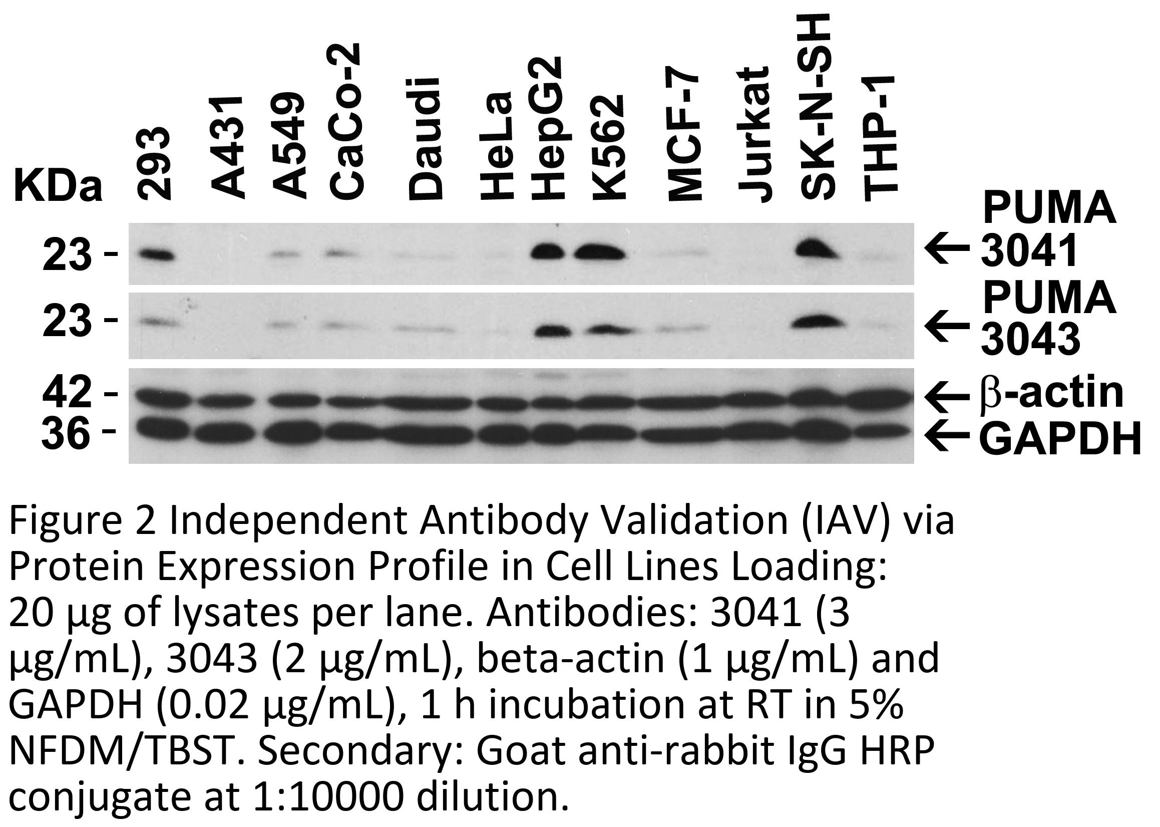 Independent Antibody Validation (Figure 2) shows similar PUMA expression profile in both human and mouse cell lines detected by two independent anti-PUMA antibodies that recognize different epitopes, 3041 against C-terminus and 3043 against the N-terminus. PUMA proteins are detected in most of the cell lines with different expression levels by the two independent antibodies.