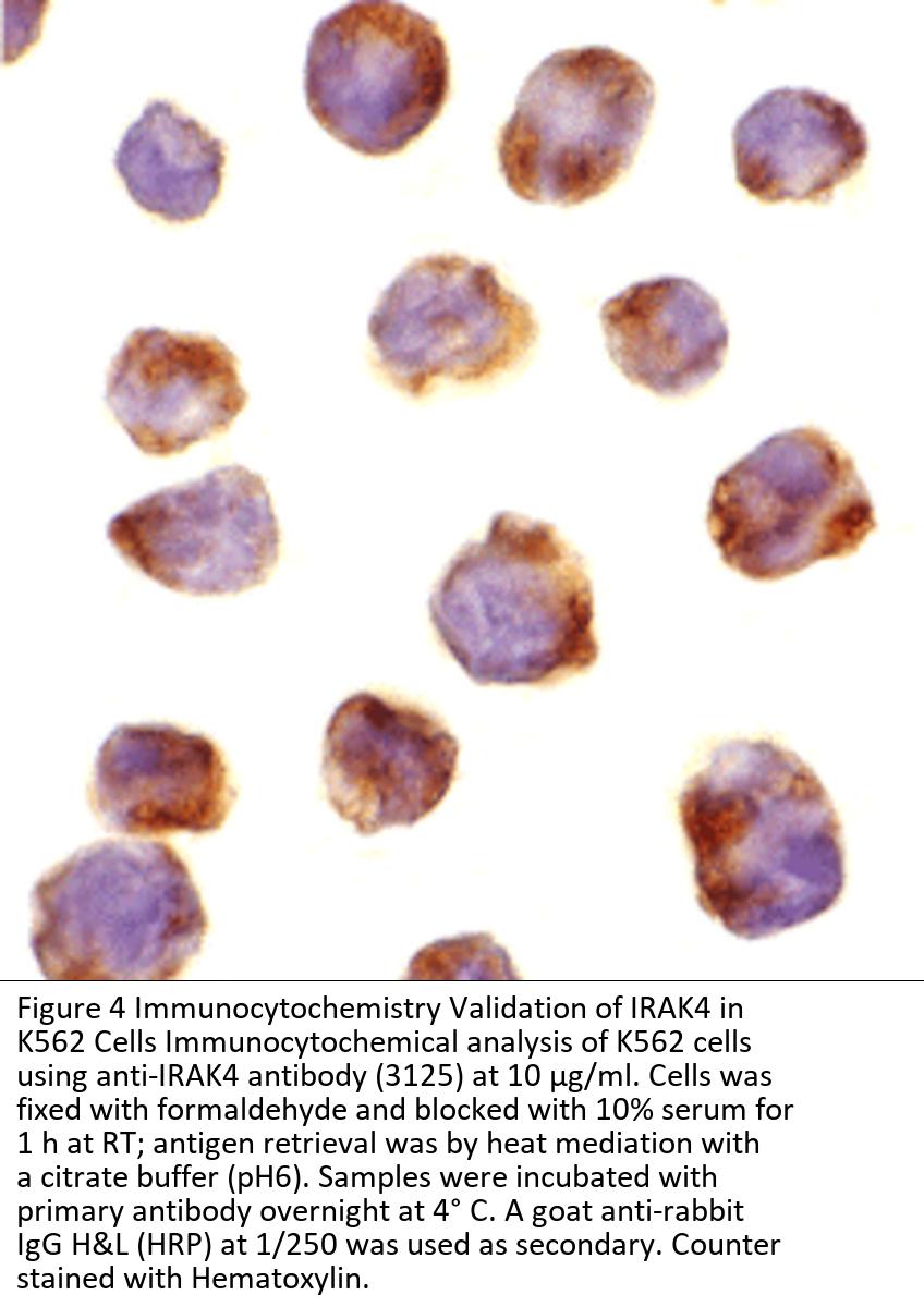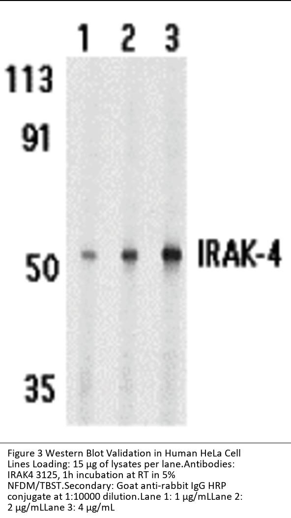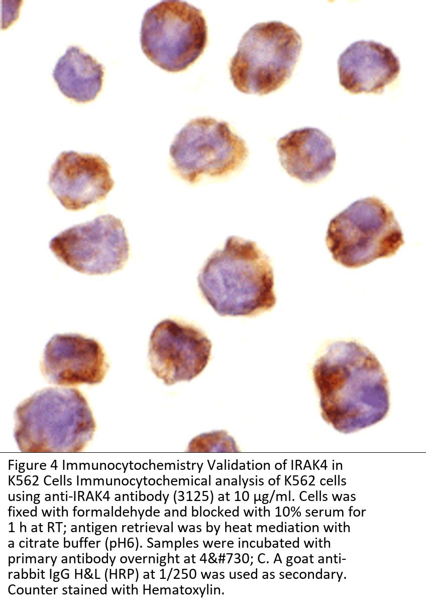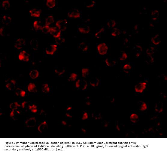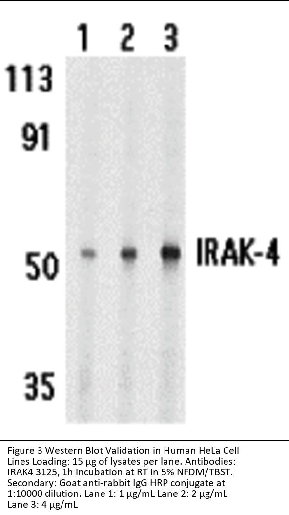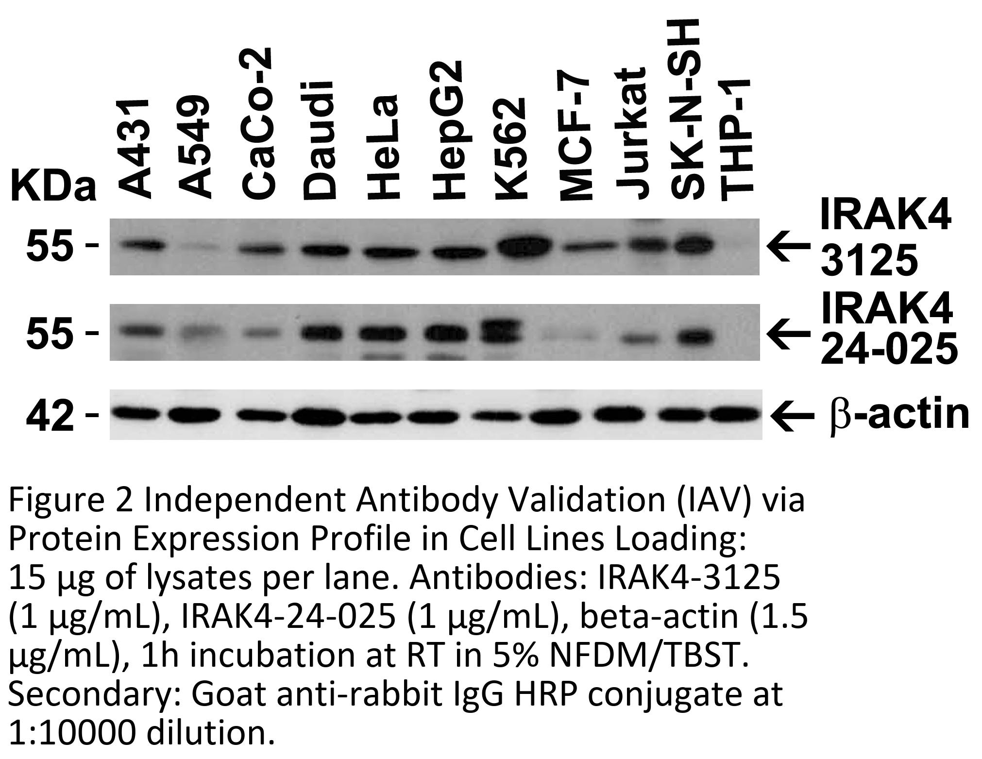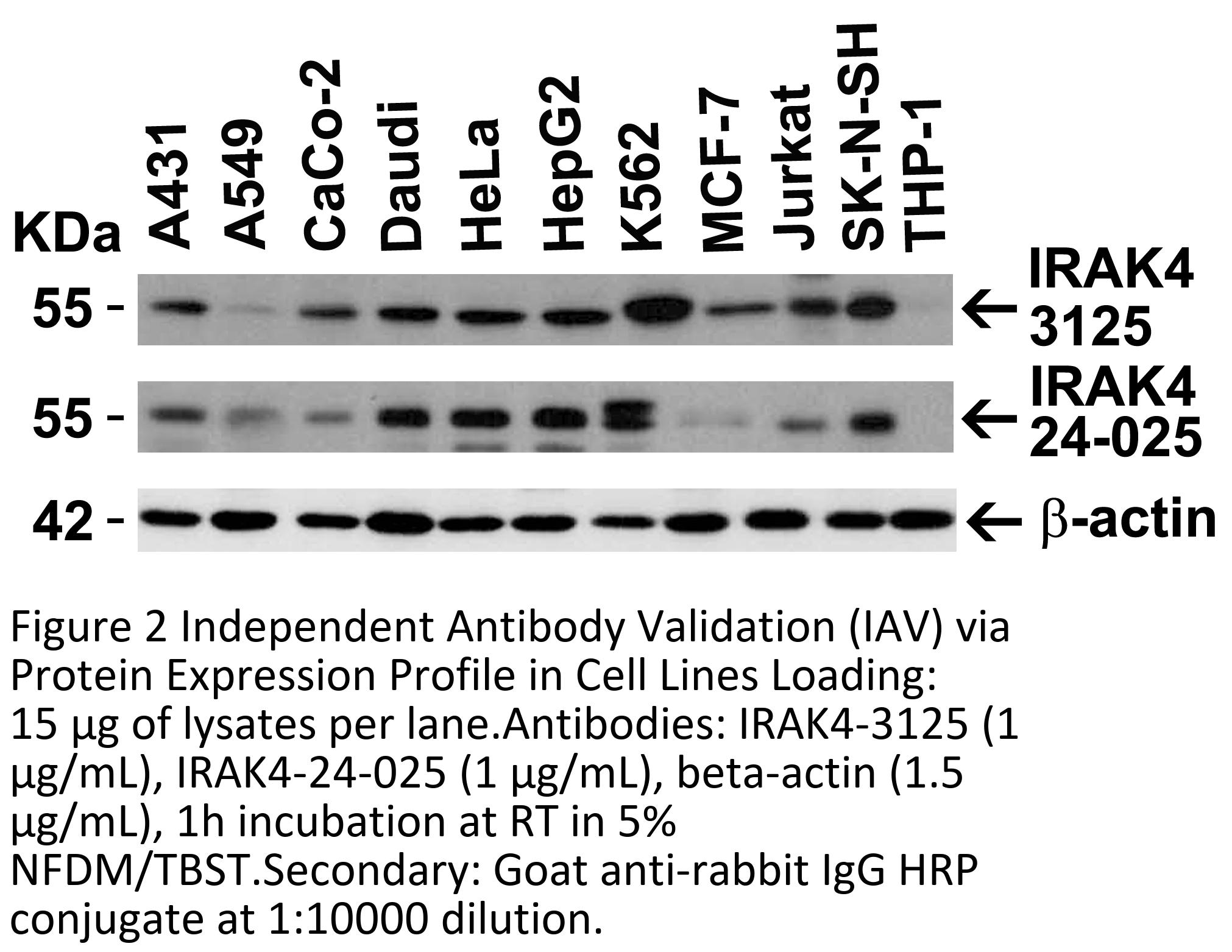 Independent Antibody Validation in Cell lines (Figure 2) shows similar IRAK4 expression profile in human cell lines detected by two independent anti-IRAK4 antibodies that recognize different epitopes, 3125 against C-terminus domain and 24-025 against recombinant fusion protein. IRAK4 proteins are detected in the most tested cell lines at different expression levels by the two independent antibodies.