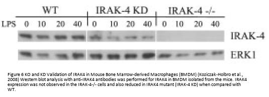 KO validation (Figure 6): Anti-IRAK4 antibody (3125) specificity was further verified by IRAK4 knockout and mutant mice. IRAK4 signal in the macrophages of IRAK KO mice and mutant mice was disrupted as compared to wild type mice.