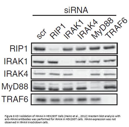 KD validation (Figure 8): Anti-IRAK4 antibody (3125) specificity was further verified by IRAK4 knockdown. IRAK4 signal was disrupted in HEK293T cells transfected with IRAK4 siRNAs.