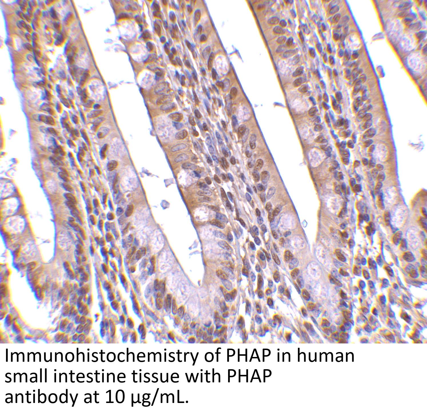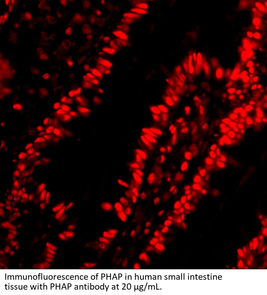 PHAP antibody can be used for detection of PHAP I and PHAP III by Western blot at 1 μ g/mL. At approximately 35 kDa and 32 kDa a band can be detected. Antibody can also be used for immunohistochemistry starting at 10 μ g/mL. For immunofluorescence start at 20 μ g/mL.