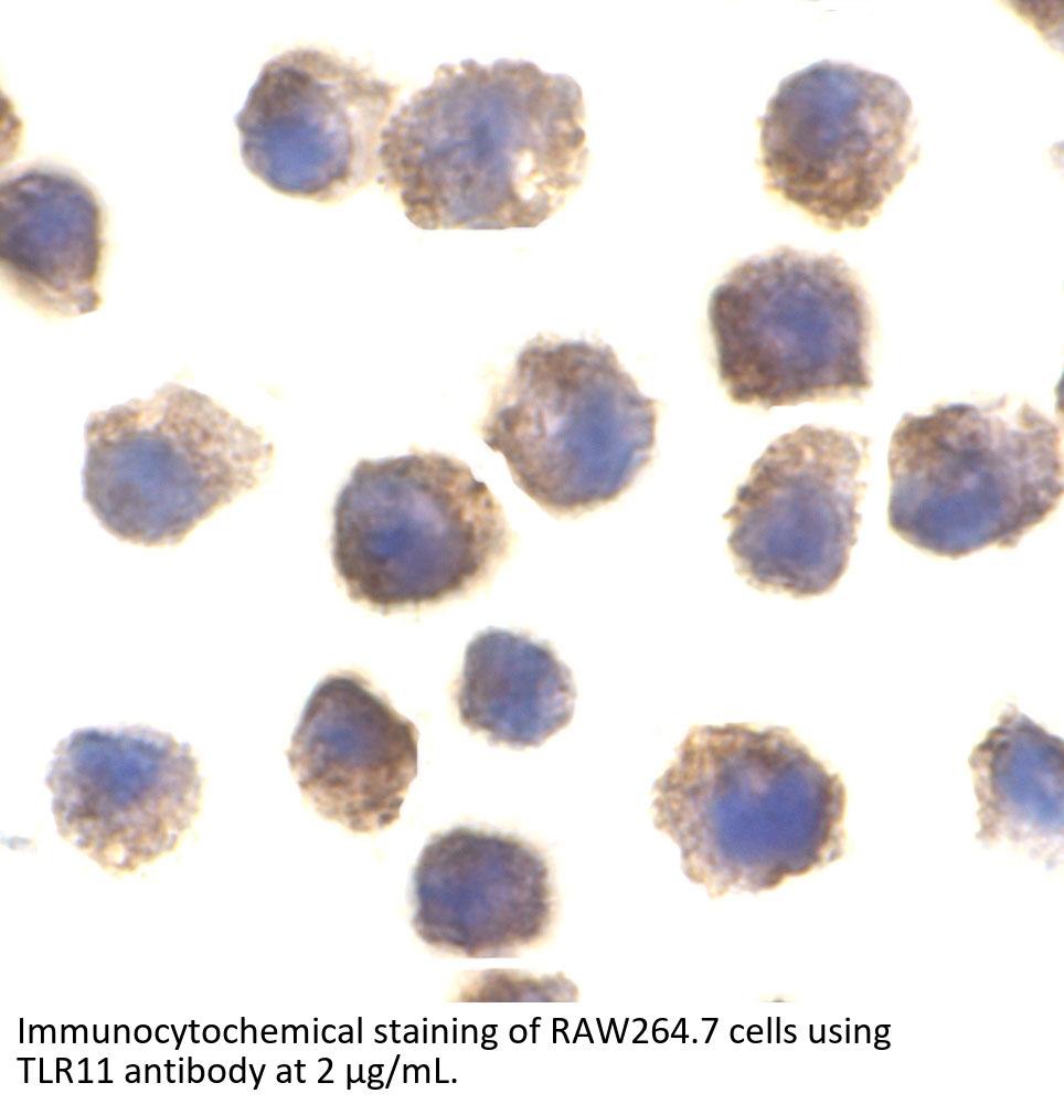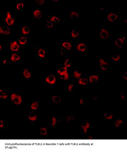 TLR11 antibody can be used for detection of TLR11 by Western blot at 0.5 to 1 μ g/mL. Antibody can also be used for immunocytochemistry starting at 2 μ g/mL. For immunofluorescence start at 10 μ g/mL.