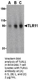 TLR11 Antibody: Toll-like receptors (TLRs) are signaling molecules that recognize different microbial products during infection and serve as an important link between the innate and adaptive immune responses. These proteins act through adaptor molecules such as MyD88 and TIRAP to activate various kinases and transcription factors. TLR11 is one of three mouse TLRs that lack a human ortholog. It is activated specifically by uropathogenic bacteria, and mice lacking TLR11 showed a much greater susceptability to uropathogenic infections, indicating a potentially important role for TLR11 in preventing infections in the urogenital system.
