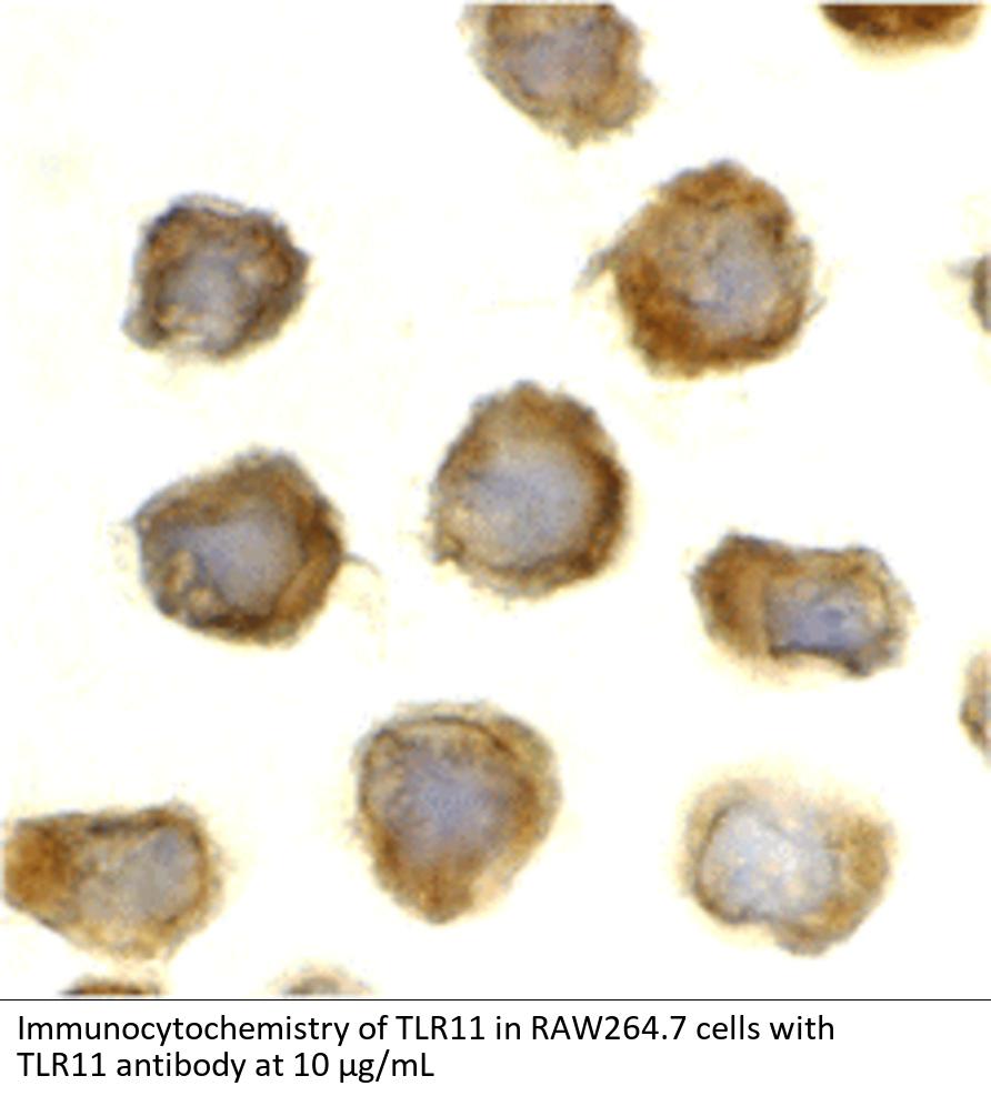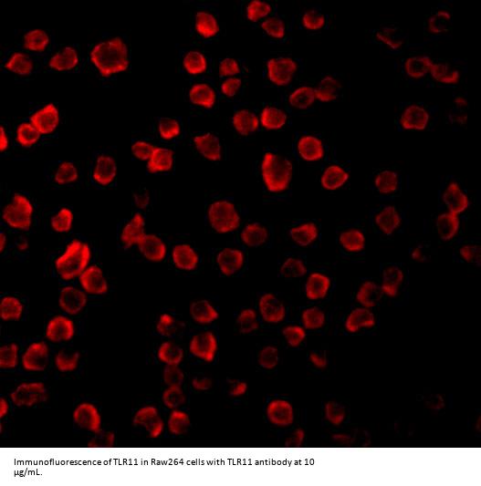 TLR11 antibody polyclonal antibody can be used for detection of TLR11 by Western blot at 0.5 to 2 μ g/mL. Antibody can also be used for immunocytochemistry starting at 10 μ g/mL. For immunofluorescence start at 10 μ g/mL.
