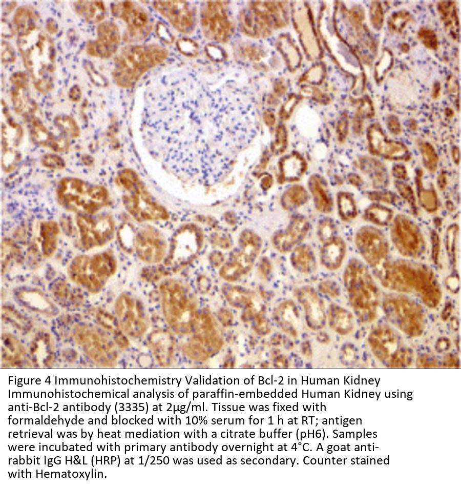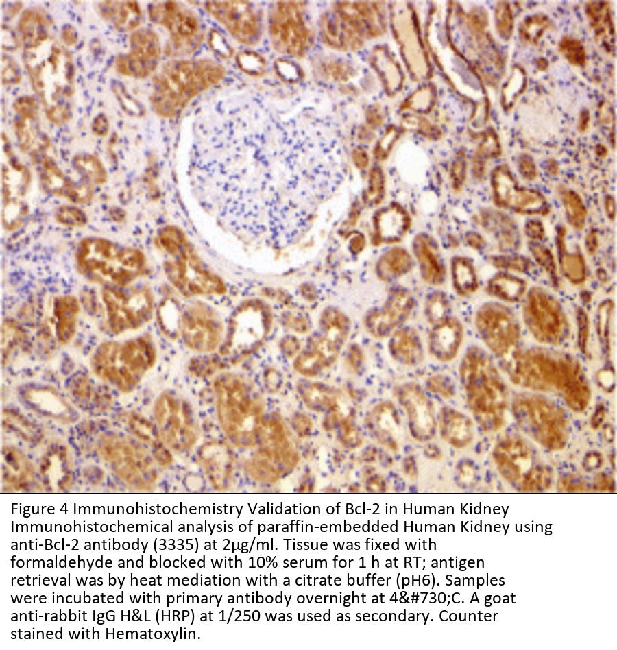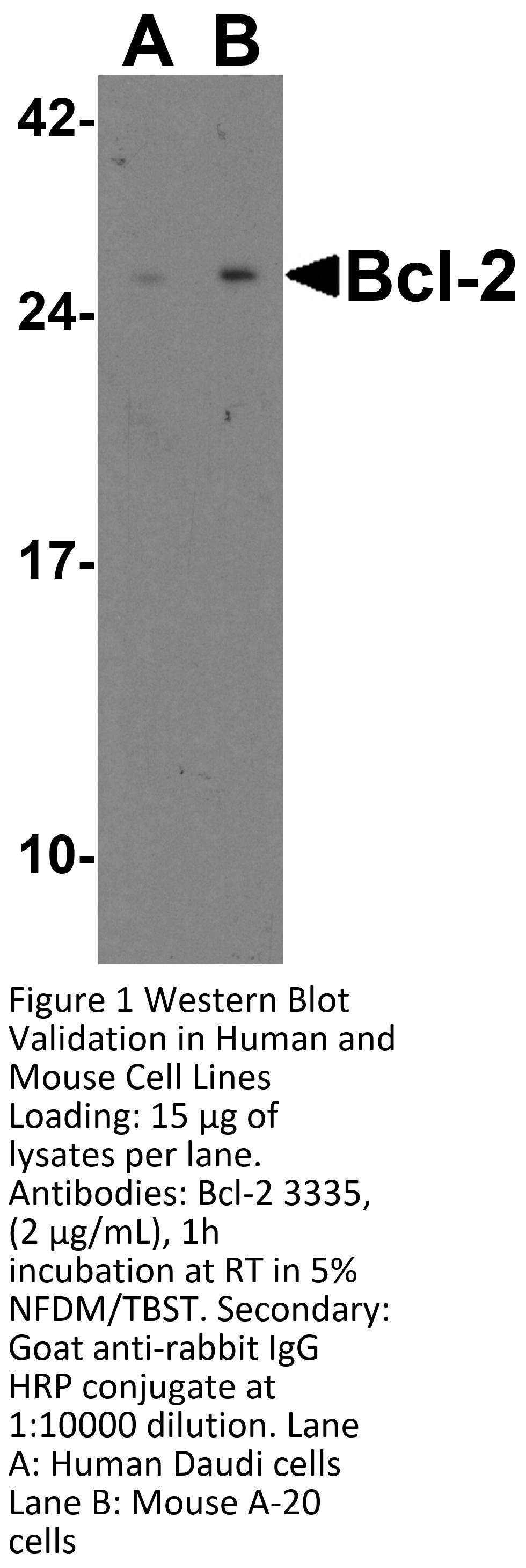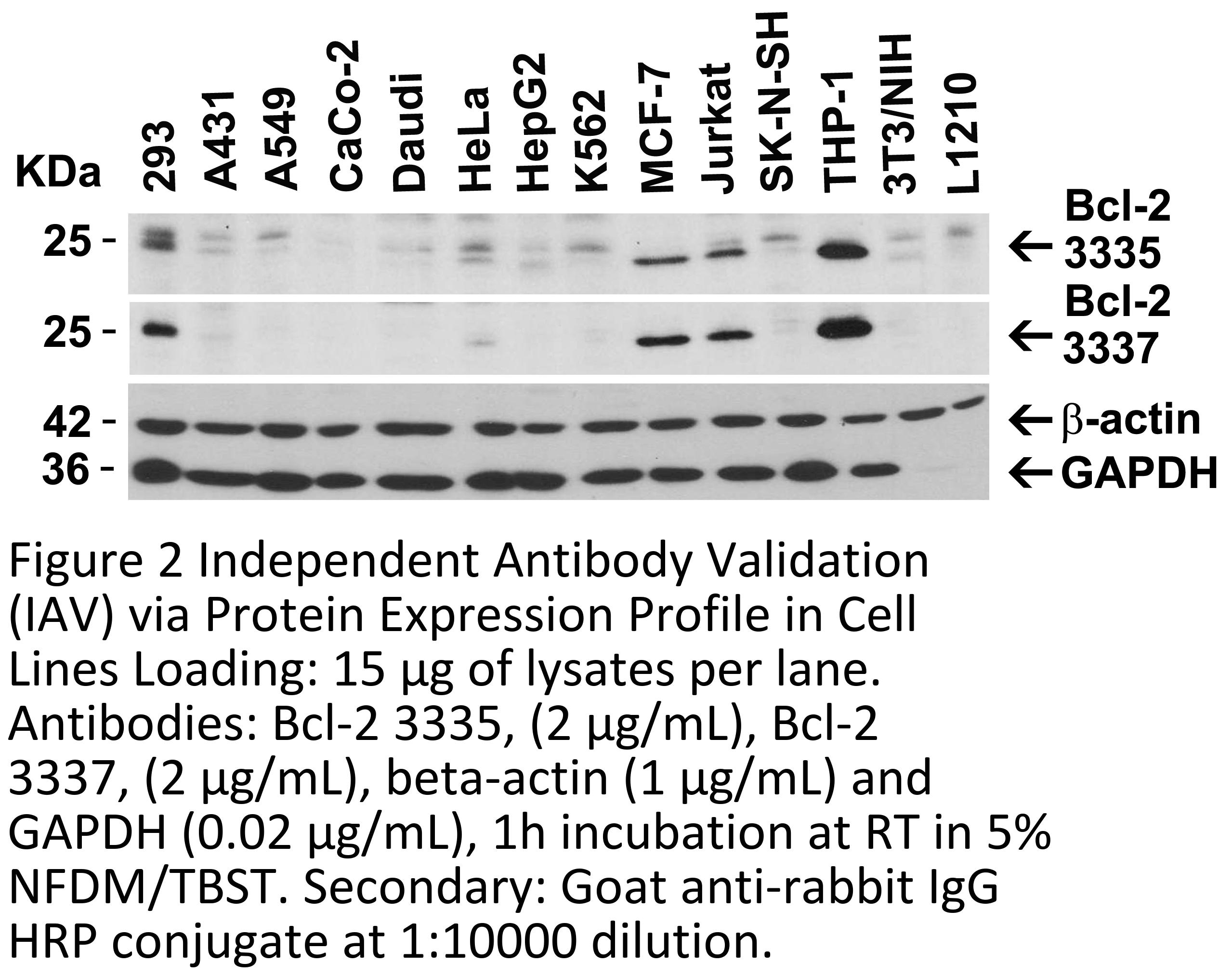 Independent Antibody Validation in Cell lines (Figure 2) shows similar Bcl-2 expression profile in human and mouse cell lines detected by two independent anti-Bcl-2 antibodies that recognize different epitopes, 3335 against N-terminus domain and 3337 against central domain.  Bcl-2 proteins are detected in several tested cell lines at different expression levels by the two independent antibodies.