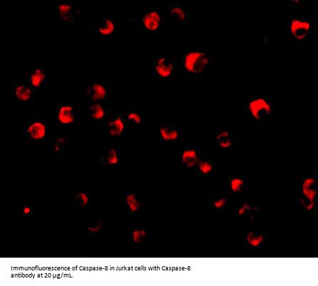 Caspase-8 Antibody: Caspases are a family of cysteine proteases that can be divided into the apoptotic and inflammatory caspase subfamilies. Unlike the apoptotic caspases, members of the inflammatory subfamily are generally not involved in cell death but are associated with the immune response to microbial pathogens. The apoptotic subfamily can be further divided into initiator caspases, which are activated in response to death signals, and executioner caspases, which are activated by the initiator caspases and are responsible for cleavage of cellular substrates that ultimately lead to cell death. Caspase-8 is an initiator caspase that was identified as a member of the Fas/APO-1 death-inducing signaling complex. The adaptor molecule FADD couples procaspase-8 to the Fas receptor death domain; subsequent oligomerization promotes procaspase-8 autoactivation. FLIP, a catalytically inactive caspase-8-like molecule inhibits these interactions and thus can inhibit apoptosis.