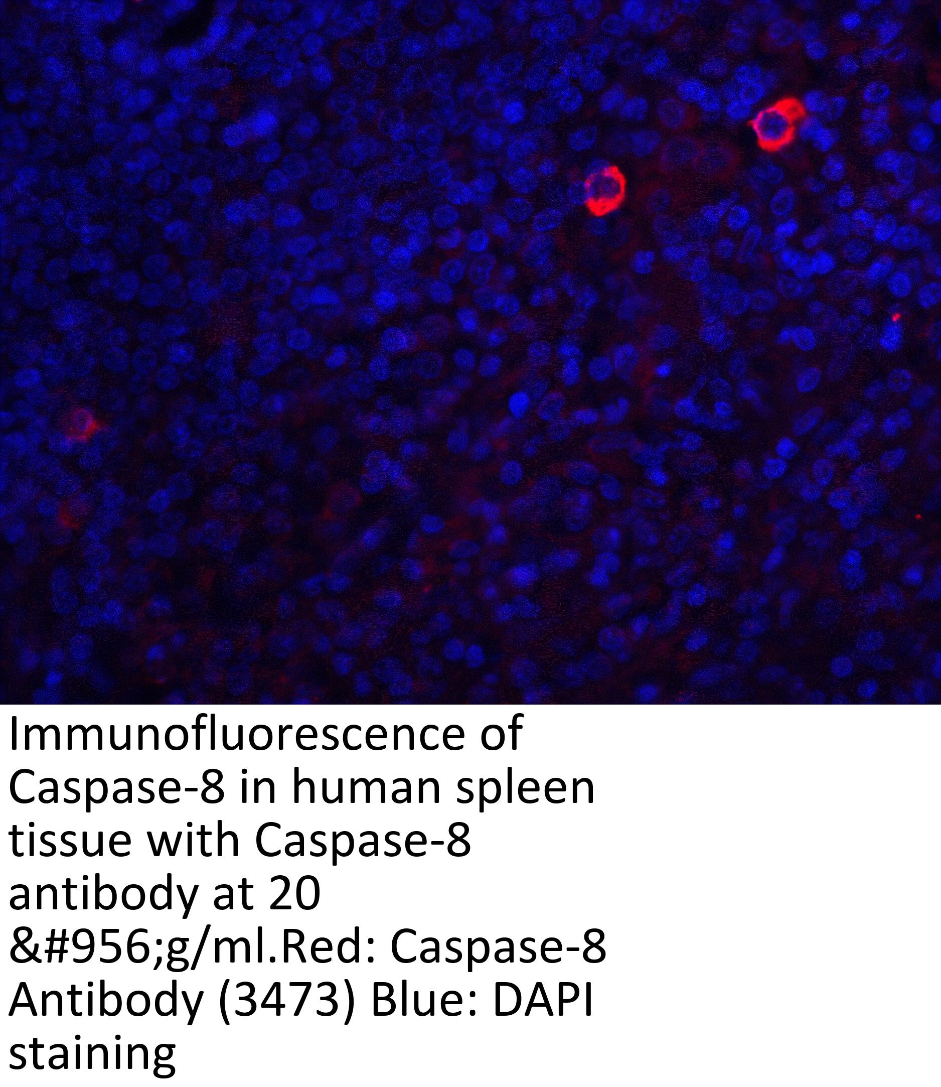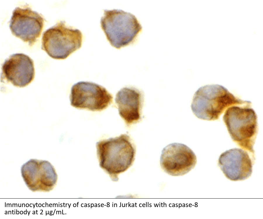 Caspase-8 antibody can be used for the detection of caspase-8 by Western blot at 0.5 to 2 μ g/mL. Antibody can also be used for immunocytochemistry starting at 2 μ g/mL and immunohistochemistry starting at 5 μ g/mL. For immunofluorescence start at 20 μ g/mL.