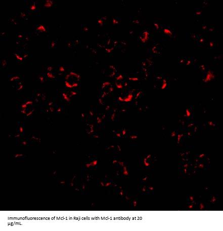 Mcl-1 Antibody: Myeloid cell leukimia-1 (Mcl-1) is a member of the Bcl-2 family of proteins that can act to promote cell survival. While the mechanism by which Mcl-1 inhibits apoptosis is not known, it is thought that it may heterodimerize and neutralize pro-apoptotic members of the Bcl-2 family such as Bim or Bak. Mcl-1 was originally identified in differentiating myeloid cells, but has since been shown to be expressed in multiple cell types. Mcl-1 is essential for embryogenesis and for the development and maintenance of B and T lymphocytes in animals. Mcl-1 exists as at least three distinct isoforms designated Mcl-1L, Mcl-1S and Mcl-1ES. In marked contrast to the larger isoform of Mcl-1, overexpression of Mcl-1S promotes cell death.