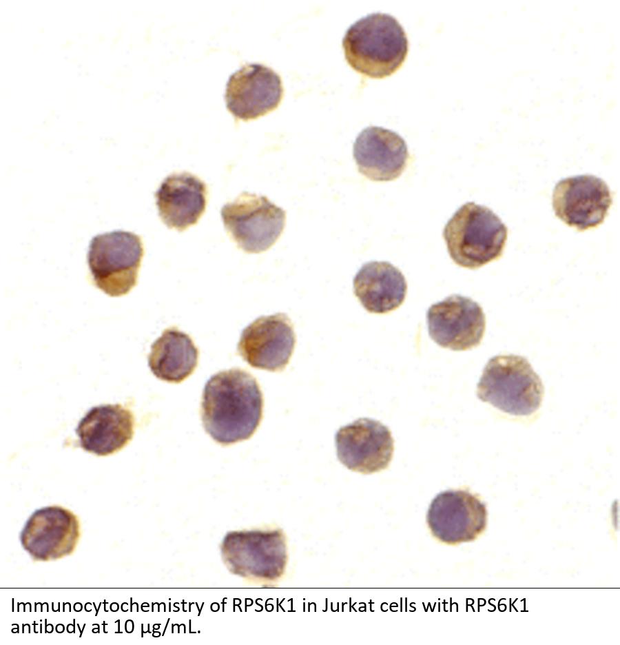 RPS6K1antibody can be used for the detection of RPS6K1 by Western blot at 2.5 - 10 μ g/mL. Antibody can also be used for immunocytochemistry starting at 10 μ g/mL. For immunofluorescence start at 20 μ g/mL.