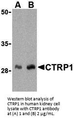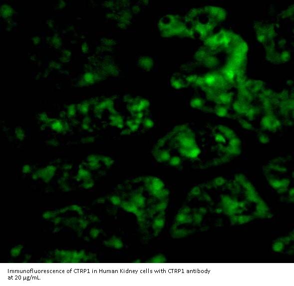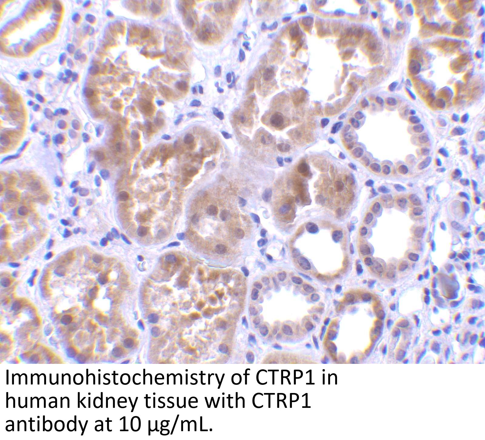 CTRP1 antibody can be used for the detection of CTRP1 by Western blot at 1 and 2 μ g/mL. Antibody can also be used for immunohistochemistry starting at 10 μ g/mL. For immunofluorescence start at 20 μ g/mL.