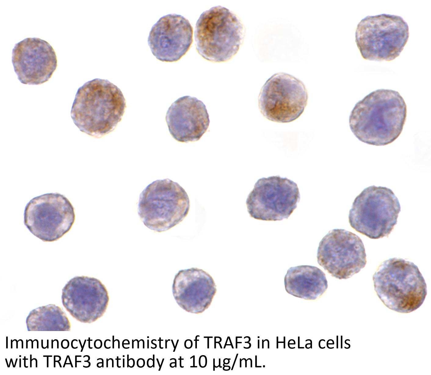 TRAF3 antibody can be used for the detection of TRAF3 by Western blot at 2 - 4 μ g/mL. Antibody can also be used for immunocytochemistry starting at 10 μ g/mL.
