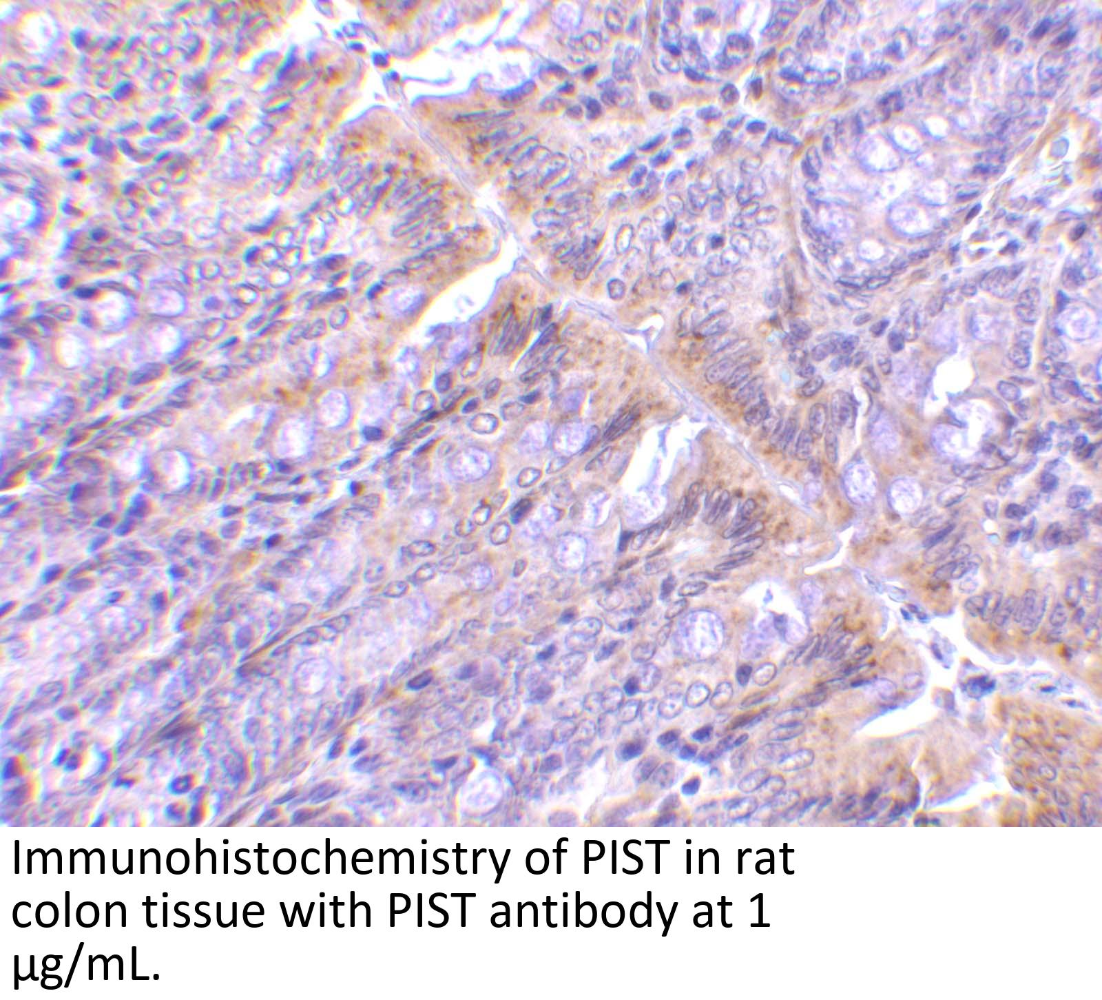 PIST Antibody: Autophagy, the process of bulk degradation of cellular proteins through an autophagosomic-lysosomal pathway is important for normal growth control and may be defective in tumor cells. It is involved in the preservation of cellular nutrients under starvation conditions as well as the normal turnover of cytosolic components and is negatively regulated by TOR (Target of rapamycin). PIST, a PDZ-containing protein, was discovered in a yeast two-hybrid system as a binding partner to Beclin-1, a Bcl-2-interacting protein homologous to the yeast autophagy gene apg6. Experiments with mutant PIST proteins lacking the PDZ domain showed that PIST interaction with Beclin-1 through its coiled-coil domain can modulate Beclin-1 activity and suggest that PIST interactions with other proteins through its PDZ domain may regulate the activity of PIST and Beclin-1.