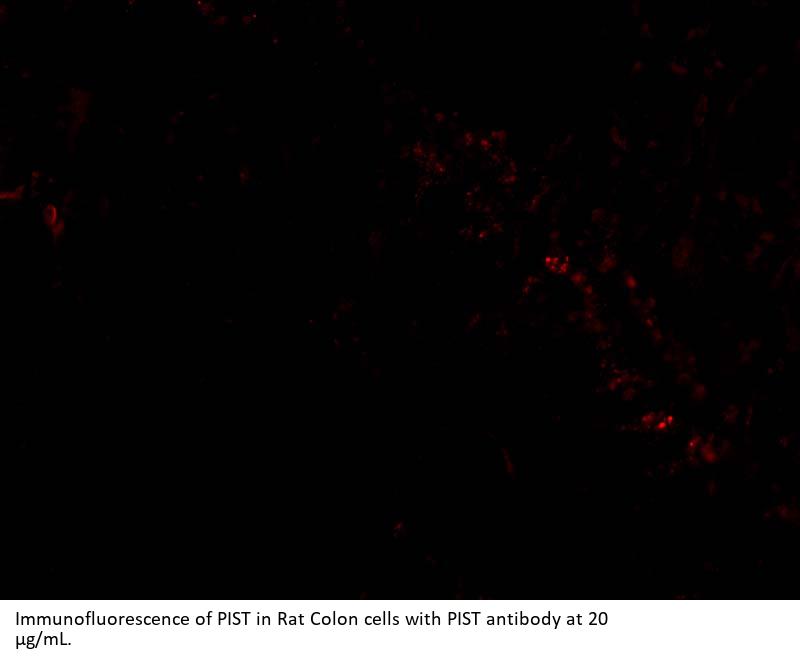 PIST antibody can be used for the detection of PIST by Western blot at 1 - 4 μ g/mL. Antibody can also be used for immunohistochemistry starting at 1 μ g/mL. For immunofluorescence start at 20 μ g/mL.