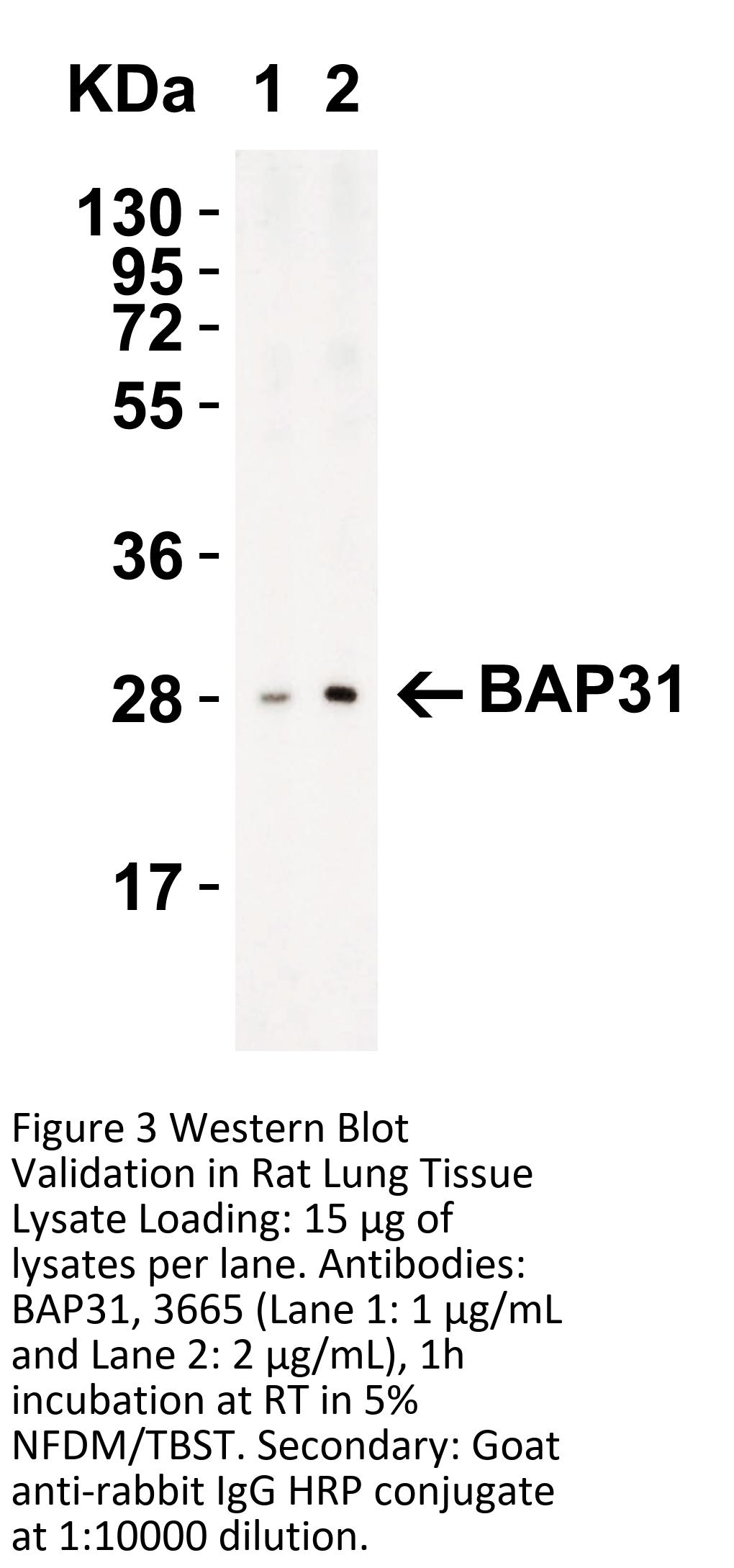 Human BAP31 has 2 isoforms, including isoform 1 (246aa, 28kD) and isoform 2 (313aa, 34.8kD). Mouse BAP31 has one isoform (245aa, 28kD) and Rat BAP31 also has one isoform (245aa, 28kD). 3665 can detect human, mouse and rat.