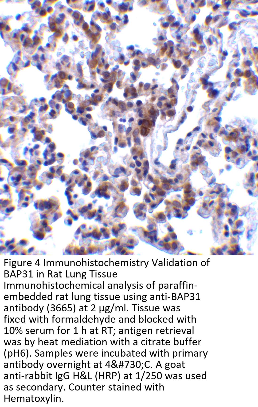 Anti-BAP31 antibody (3665) was raised against a peptide corresponding to 17 amino acids near the carboxy terminus of human BAP31.