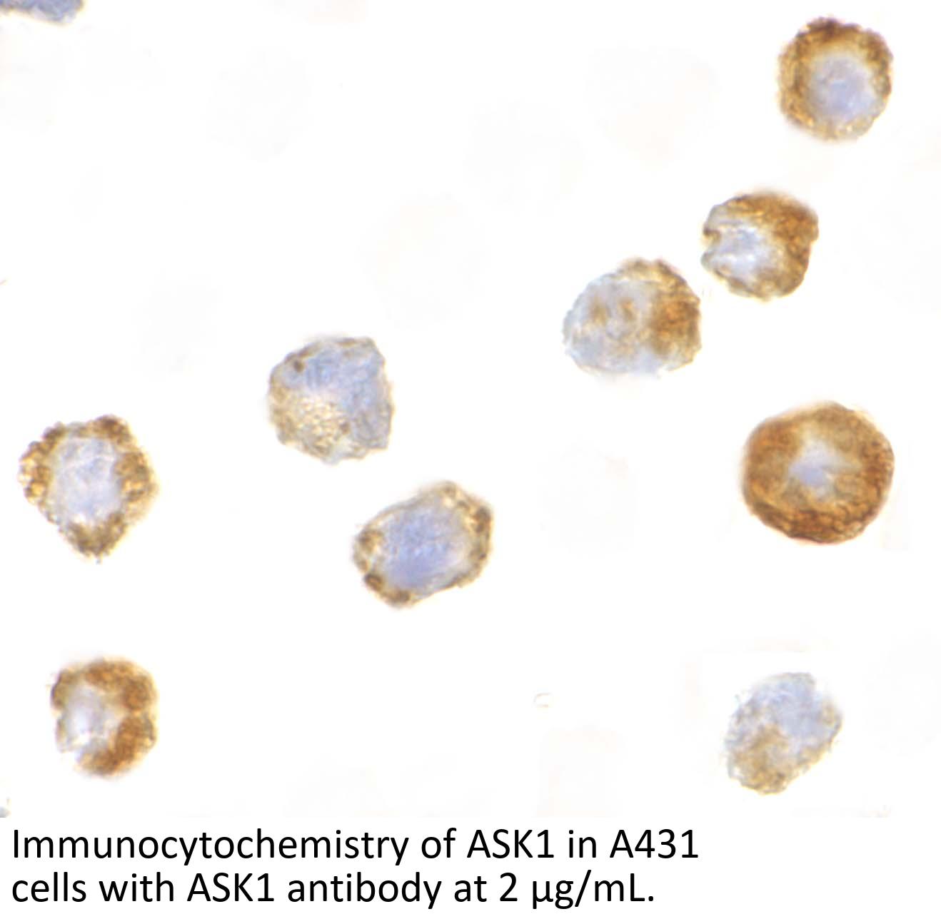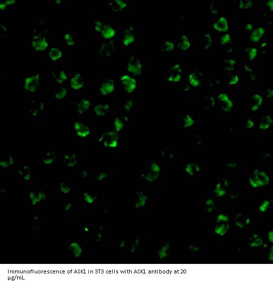 ASK1 antibody can be used for the detection of ASK1 by Western blot at 0.5 - 2 μ g/mL. Antibody can also be used for immunocytochemistry starting at 2 μ g/mL. For immunofluorescence start at 20 μ g/mL.