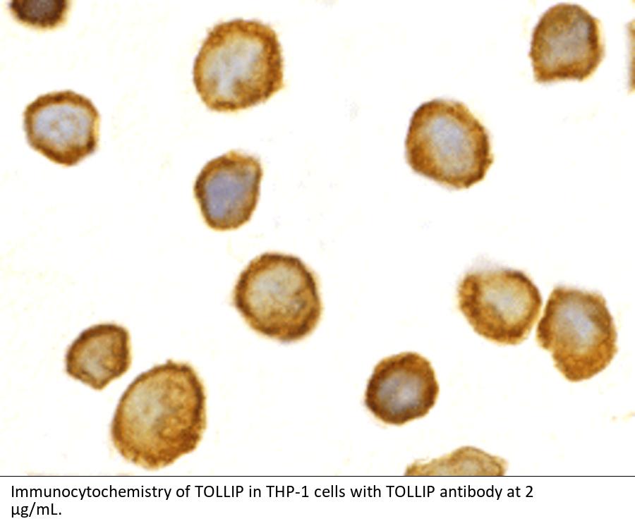 TOLLIP Antibody: Toll-like receptors (TLRs) are evolutionarily conserved pattern-recognition molecules resembling the toll proteins that mediate antimicrobial responses in Drosophila. These proteins recognize different microbial products during infection and serve as an important link between the innate and adaptive immune responses. The TLRs act through adaptor molecules to activate various kinases and transcription factors so the organism can respond to potential infection. These adaptor molecules include TOLLIP, MyD88, and TRIF. TOLLIP associates directly with TLR2 and TLR 4, acting as an inhibitor to TLR activation. This negative regulation of TLR signaling may serve to limit the production of proinflammatory mediators during infection and inflammation.