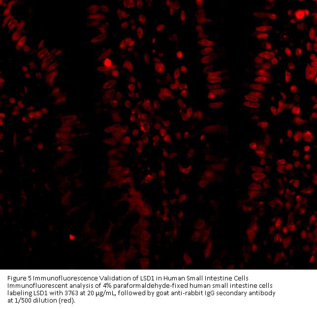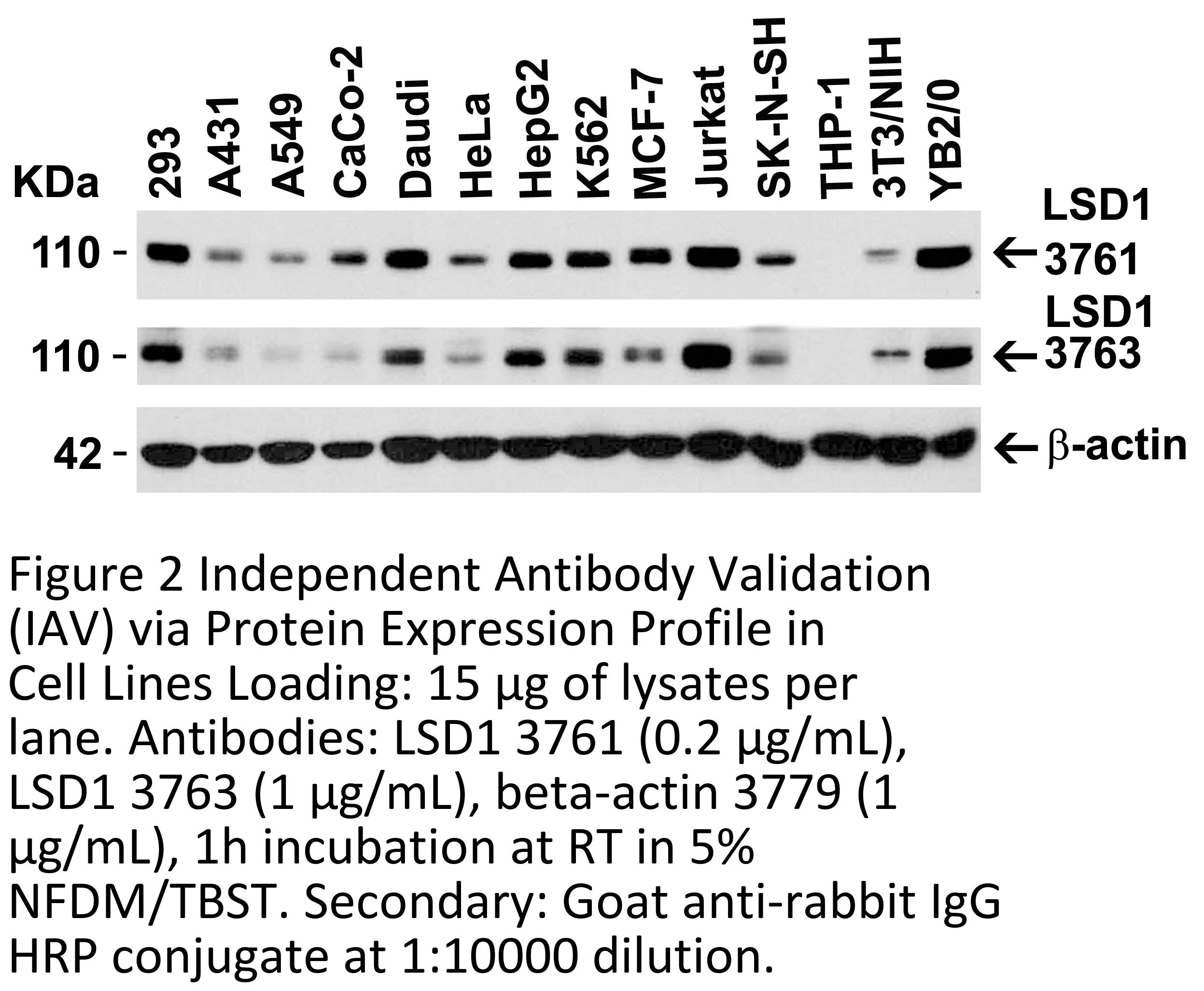 Independent Antibody Validation in Cell lines (Figure 2) shows similar LSD1 expression profile in human and mouse cell lines detected by two independent anti-LSD1 antibodies that recognize different epitopes, 3761 against N-terminus domain and 3763 against central domain. LSD1 proteins are detected in the most tested cell lines that include mouse (3T3/NIH) and rat cell lines (YB2/0) at different expression levels by the two independent antibodies.