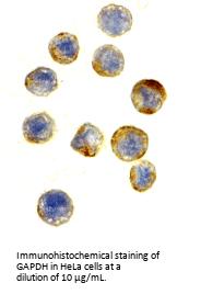 GAPDH antibody can be used for the detection of GAPDH by Western blot at 0.5 - 2 μ g/mL. Antibody can also be used for immunohistochemistry starting at 10 μ g/mL. For immunofluorescence start at 20 μ g/mL.