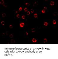 GAPDH Antibody: Glyceraldehyde-3-phosphate dehydrogenase (GAPDH) catalyzes the reversible oxidative phosphorylation of glyceraldehyde-3-phosphate in the presence of inorganic phosphate and nicotinamide adenine dinucleotide (NAD), an important energy-yielding step in carbohydrate metabolism. Recent evidence suggests that it also is involved in a number of cellular processes such as membrane fusion, phosphotransferase activity, DNA replication and repair, and nuclear RNA export. GAPDH has also been implicated in playing a role in different pathologies such as cancer progression, apoptosis, and neuronal diseases such as Alzheimer's and Huntington's disease. GAPDH is constitutively expressed at high levels in almost all tissues and cell lines making it ideal for use as a loading control marker in immunoblots.