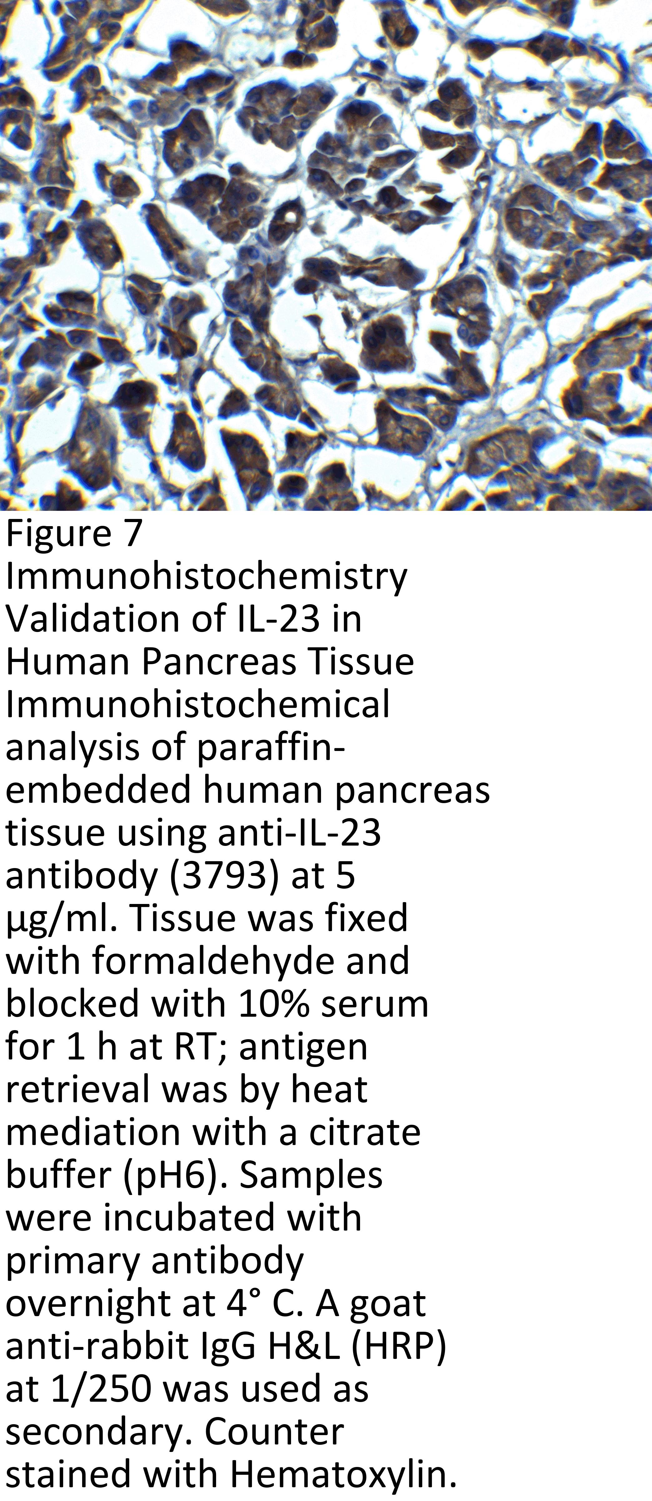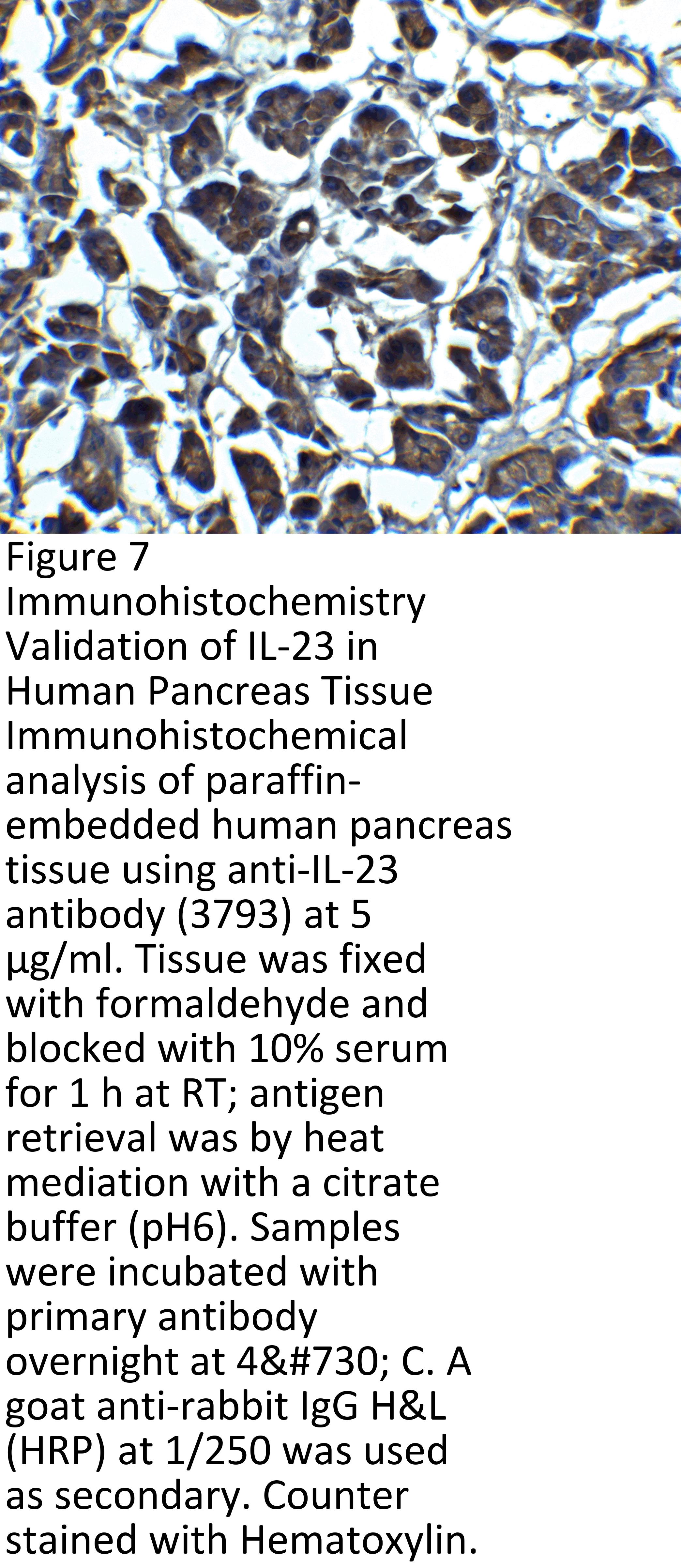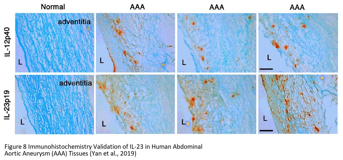 Regulated expression validation (Figure 8): IL-23 expression detected by anit-IL-23 antibodies (3793) was abundant in human abdominal aortic aneurysm (AAA) tissues whereas there is no IL-23 expression in normal tissue.