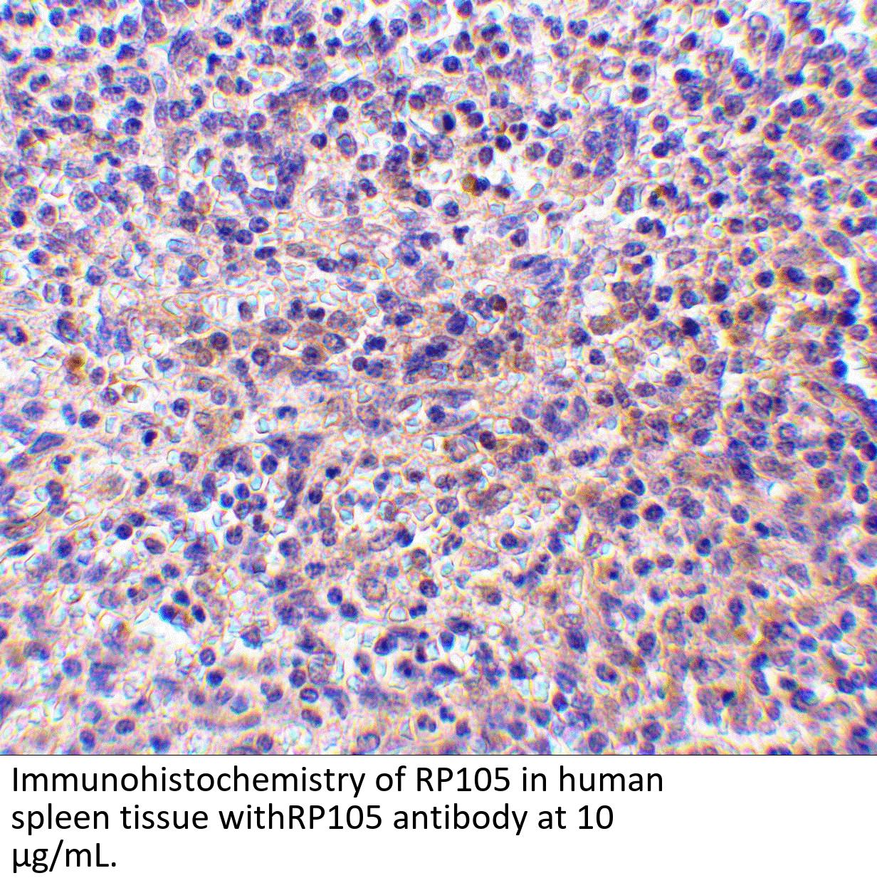 RP105 antibody can be used for the detection of RP105 by Western blot at 0.5 - 1 μ g/mL. Despite its predicted molecular weight, RP105 often migrates at 95 - 105 kDa. Antibody can also be used for immunohistochemistry starting at 10 μ g/mL.