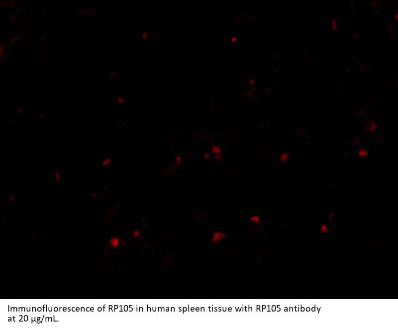 RP105 antibody can be used for the detection of RP105 by Western blot at 0.5 - 1 μ g/mL. Despite its predicted molecular weight, RP105 often migrates at 95 - 105 kDa. Antibody can also be used for immunohistochemistry starting at 2 μ g/mL. For immunofluorescence start at 20 μ g/mL.