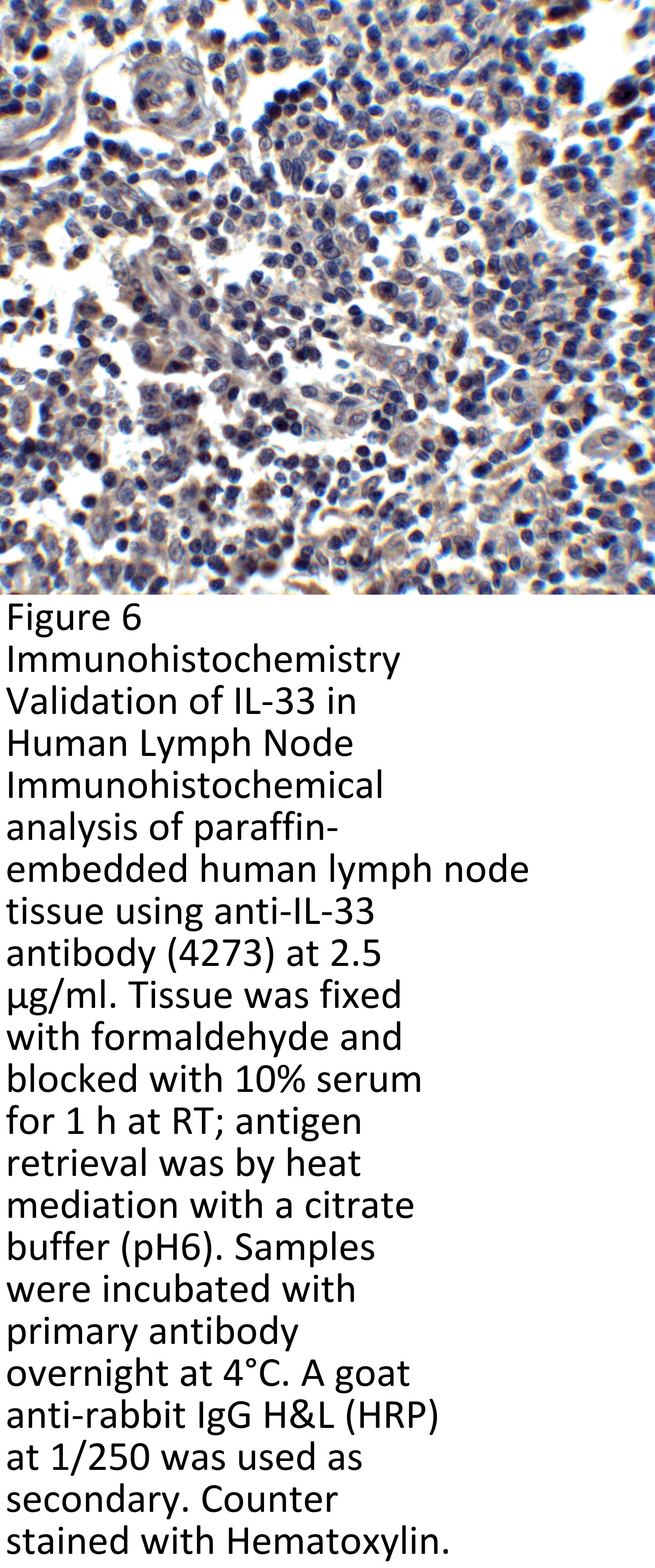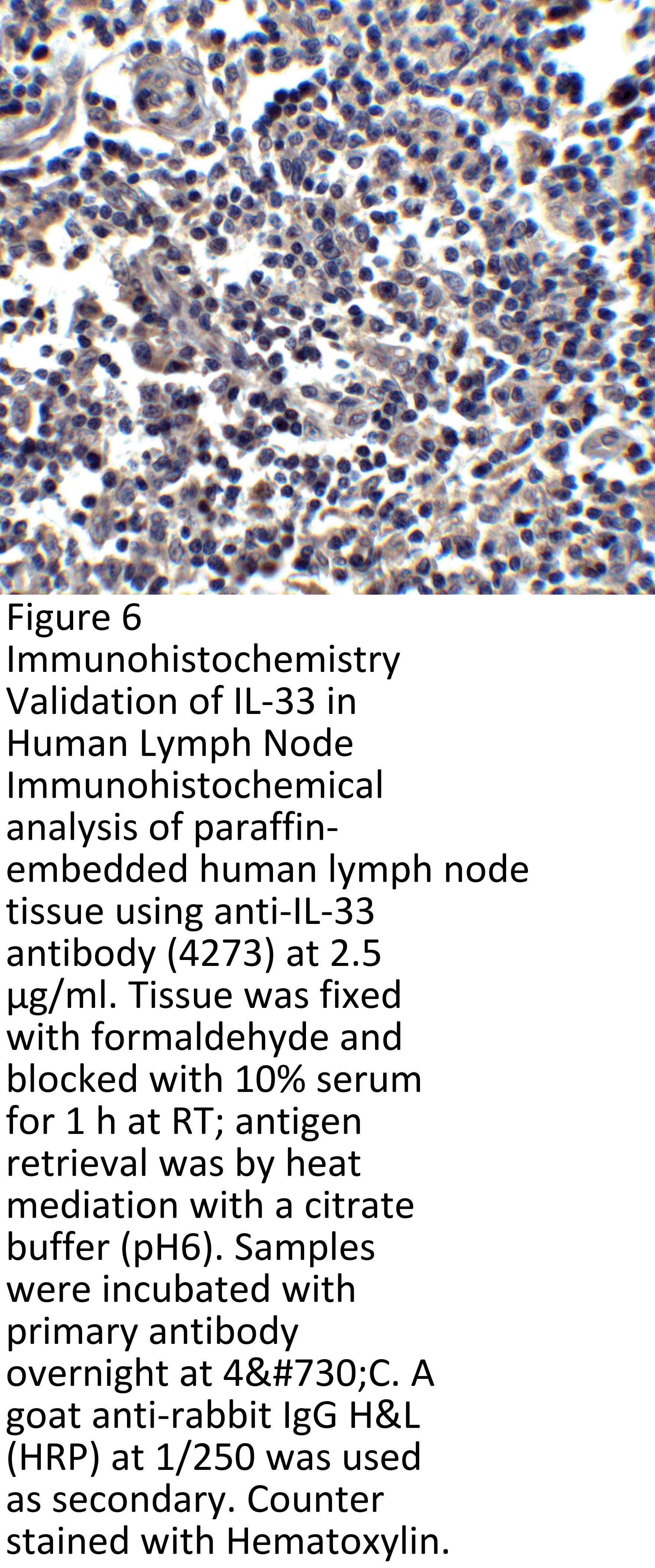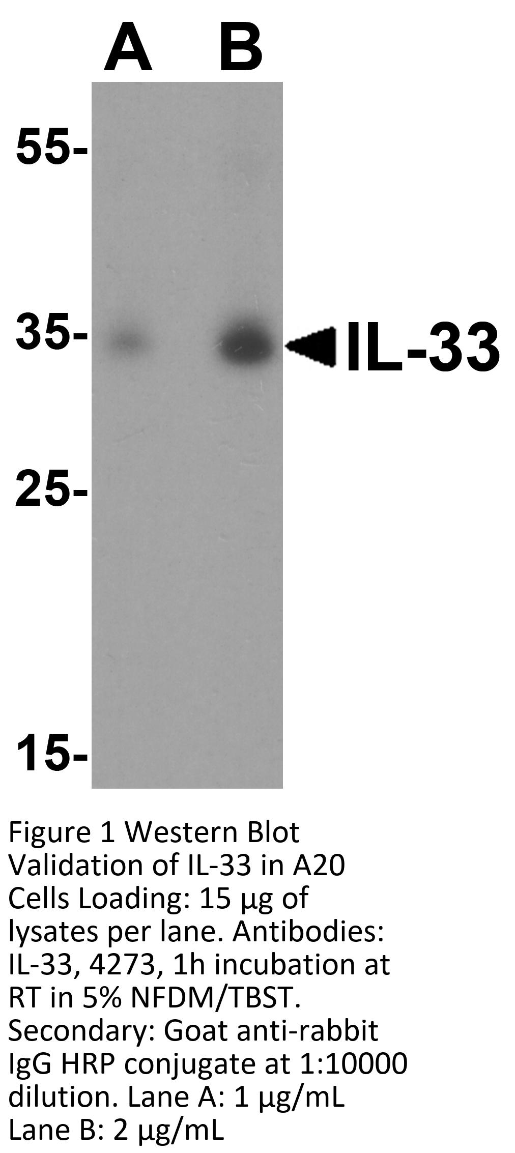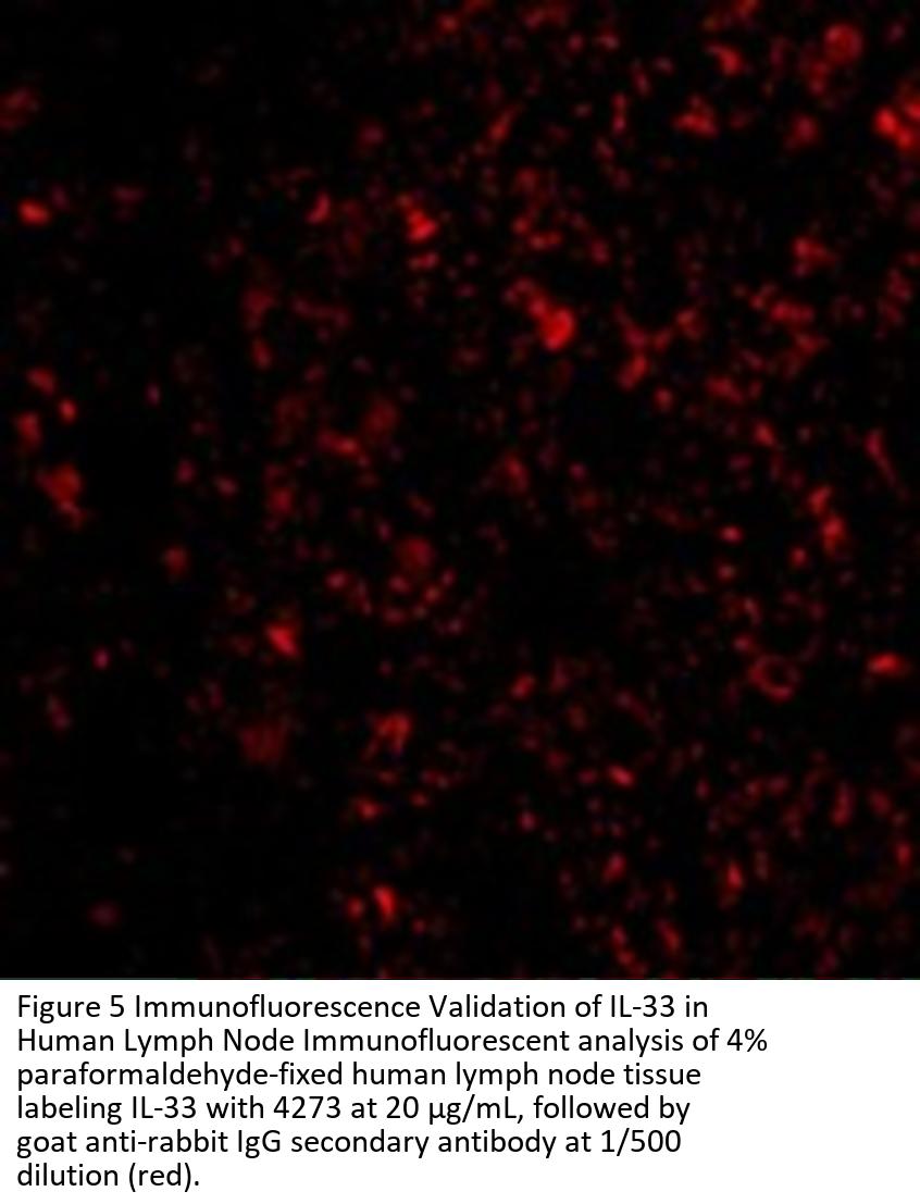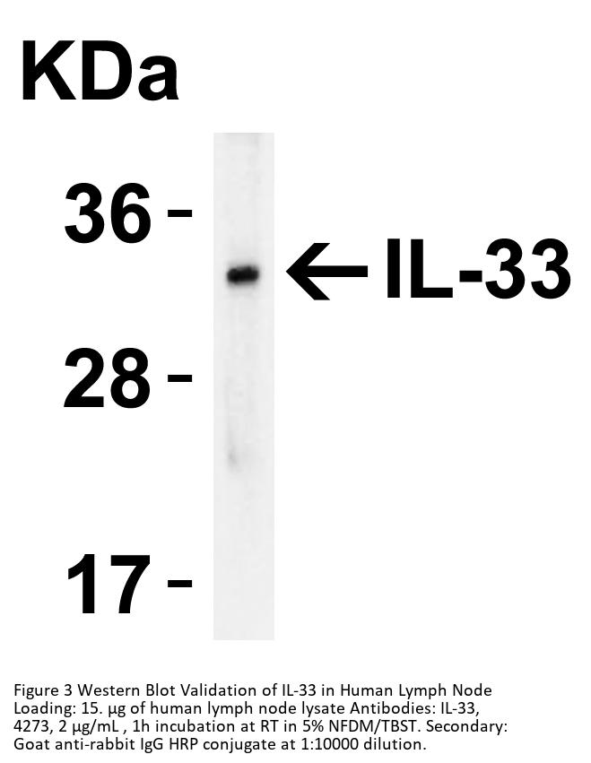Recombinant Protein Validation (Figure 2) shows expression of human partial recombinant protein IL-33 detected by anti-IL-33 antibody, 4273. Bands of 18kD (monomer) and 36kD (dimer) were observed.