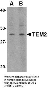 TEM2 antibody can be used for detection of TEM2 by Western blot at 1 - 2 μ g/mL. Antibody can also be used for immunohistochemistry starting at 2.5 μ g/mL. For immunofluorescence start at 20 μ g/mL.